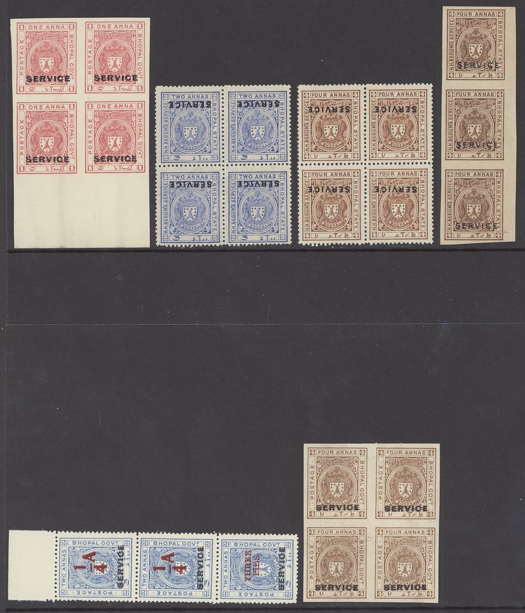 Official: 1902-11 typo overprint 1a. imperf. block of four, litho overprint 2a. and 4a. blocks of four with inverted overprints, 4a. imperf. vertical strip of three, 1932-34 "