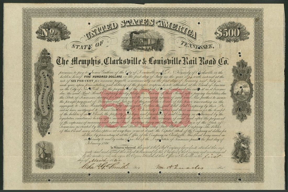 U.S.A.: Memphis, Clarksville & Louisville Rail Road Co., (TN), 6% bond for $500, 18[60], #225, several small vignettes depicting deer, crop gathering, steamship and a steam train, ornate border, black with red underprint, with coupons, hole cancelled. VF.