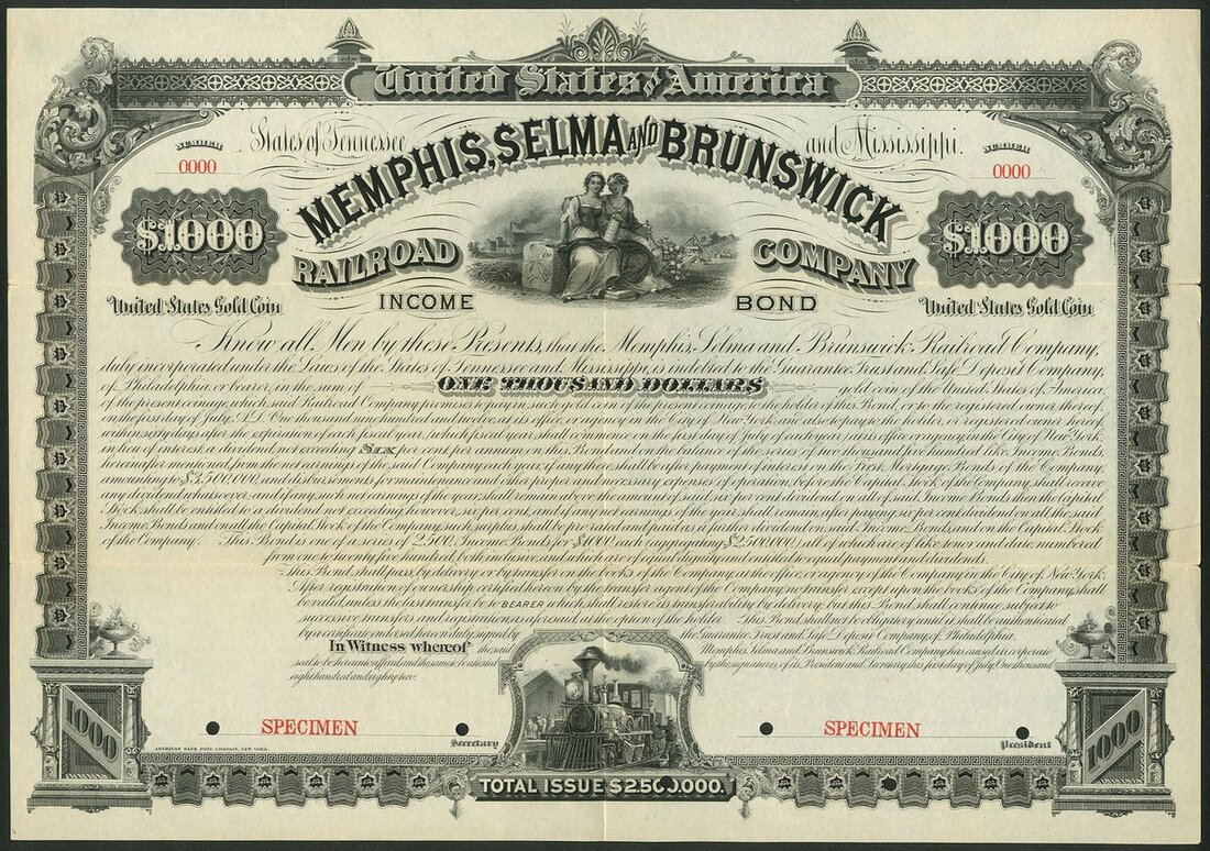 U.S.A: Memphis, Selma and Brunswick Railroad Company, a specimen income bond for $1000, 1882, steam train at bottom, allegorical figures above, overprinted SPECIMEN in red, black. Minor splitting at folds but VF and scarce.