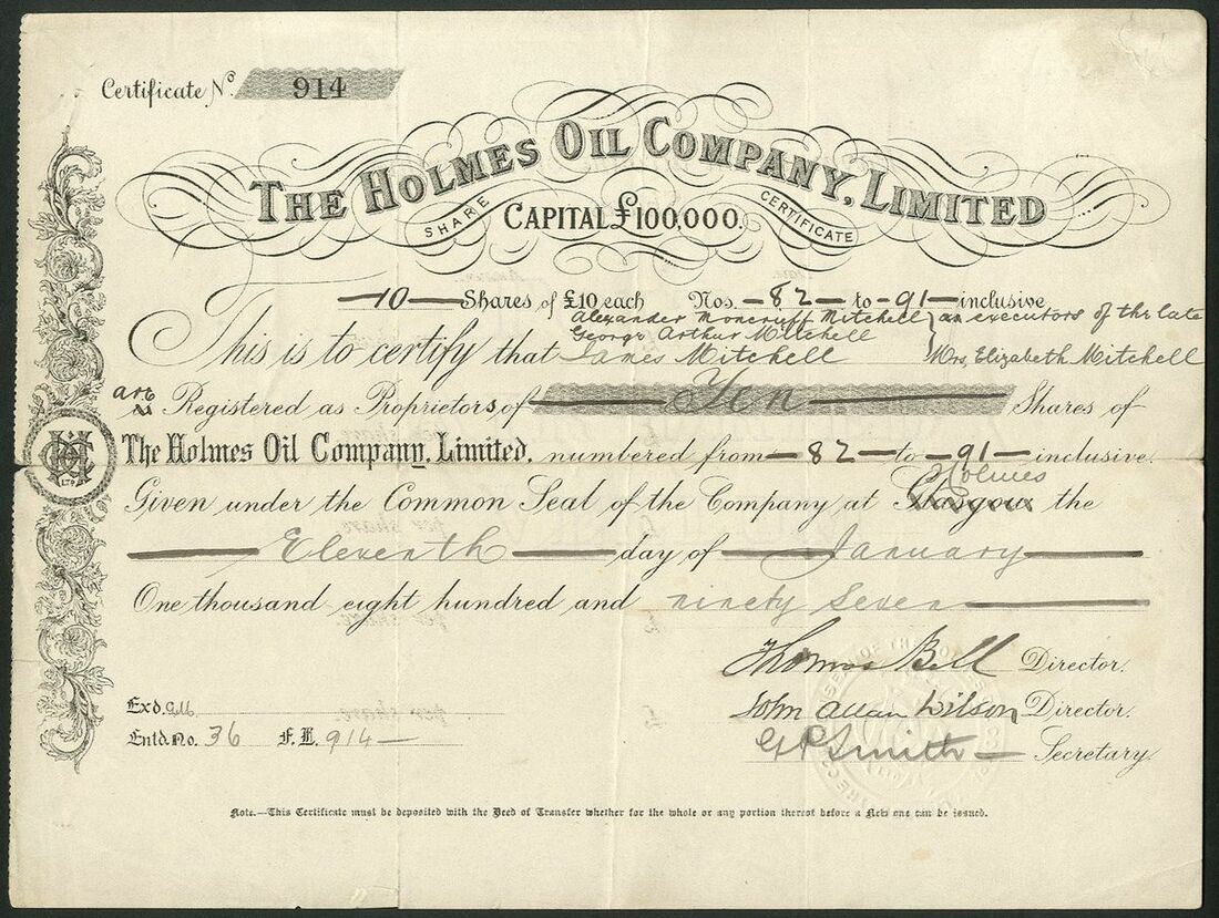Great Britain: Holmes Oil Co. Ltd., £10 shares, 18[97], #914, black with scrollwork. Formed in 1884 to acquire the shale oil works of Holmes and Goshen at Dalmahoy on the outskirts of Edinburgh. Tear top right and split on folds, F-VF and rare.