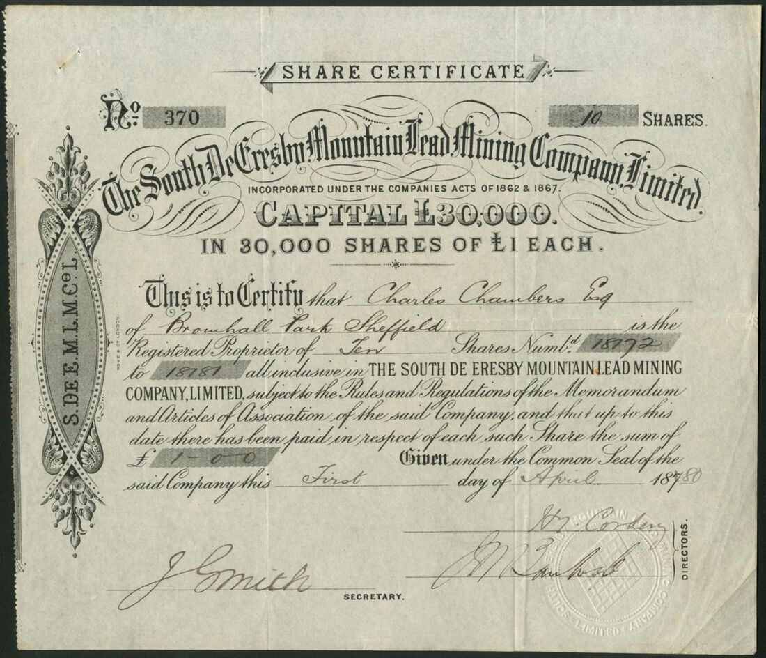 Great Britain: South De Eresby Mountain Lead Mining Co. Ltd., £1 shares, 187[80], #370, black. Mines at Bettws-y-Coed, Carnarvonshire. VF and scarce.