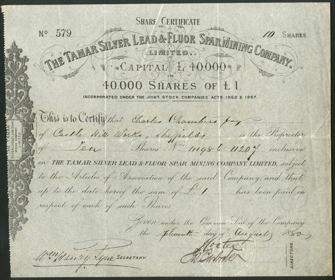 Great Britain: Tamar Silver Lead & Fluor Spar Mining Co. Ltd., £1 shares, 18[80], #579, decorative title, black. Formed in 1878 and worked in the Bere Ferrers area of Devon. The Fluorspar (fluorite) was used as a flux in the smelting process. GVF.