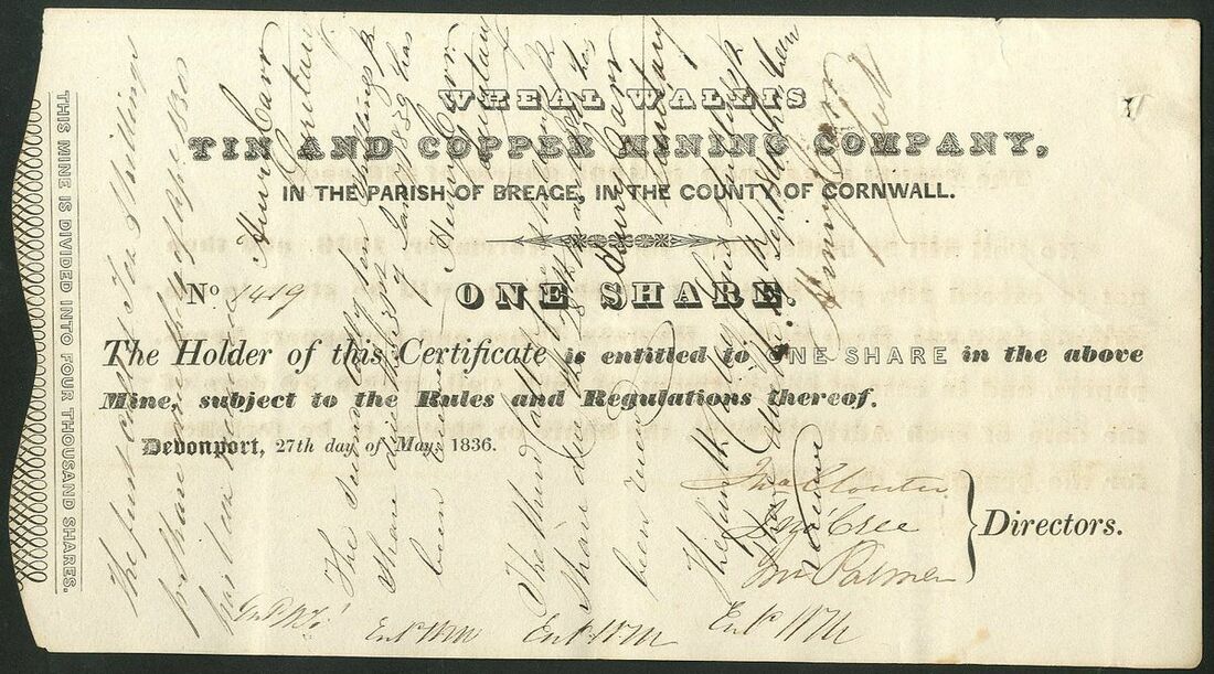 Great Britain: Wheal Wallis Tin and Copper Mining Co., one share, 1836, #1419, black. Established around 1836 with office in Devonport. Mines in the Parish of Breage, Cornwall. Spike hole top right, small tear top edge, AVF and very rare.
