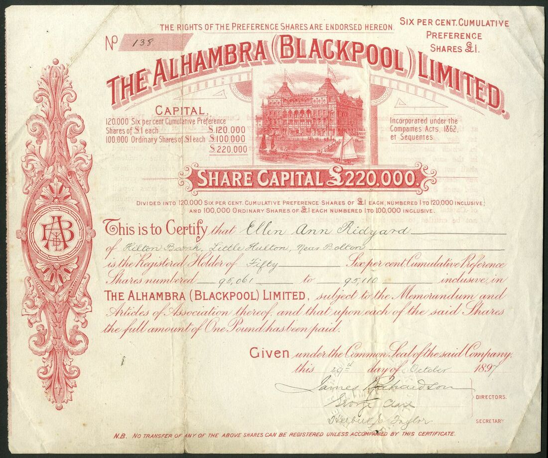 Great Britain: Alhambra (Blackpool) Limited, 6% cumulative preference shares of £1, 189[7], #138, vignette of the building, red. Couple of heavy folds, AVF and rare.|<|P>