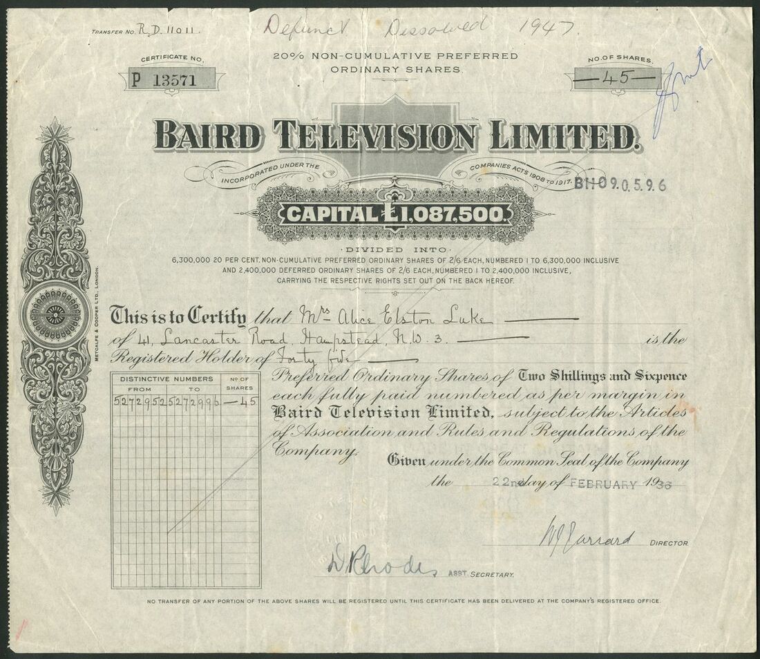 Great Britain: Baird Television Ltd., 20% non-Cumulative preferred ordinary shares of 2/6, fully paid, 19[36], black. An amalgamation of Baird International Television and Baird Television Development in 1930. Ink annotation but VF and scarce.