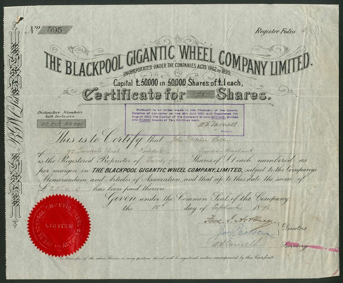 Great Britain: Blackpool Gigantic Wheel Company Ltd., £1 shares, 18[96], #595, decorative title, black, red seal. Formed in 1896 to build the ferris wheel next to Blackpool Tower. It had a total height of 67 metres and was the 4th largest in the world after Paris, Chicago and London. It consumed 1000 tons of steel. It was never as popular as the others in major cities and the company went into liquidation in 1916. Ceased operations altogether in 1928 and finally dismantled with the gondolas being sold at public auction. Spike hole top left, pink ink bottom right, VF.