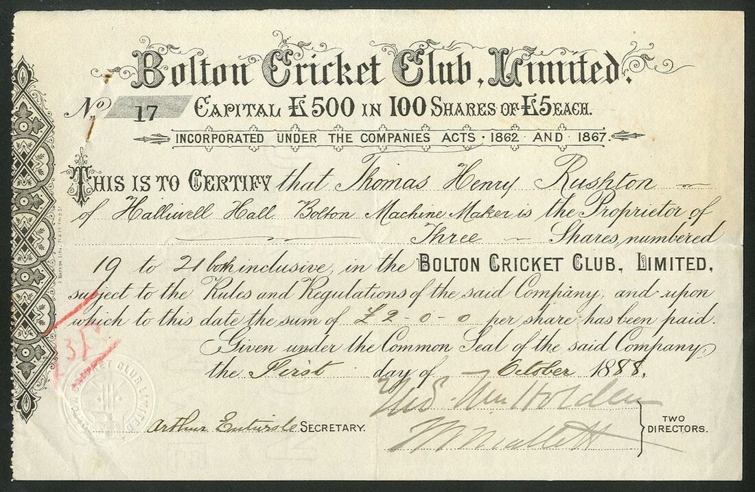 Great Britain: Bolton Cricket Club Limited, £5 shares, 18[88], #17, black. Only 100 shares issued. There was a cricket club in Bolton from the 1850's and we think this company was formed in the 1870's when the club was to build a new pavillion. VF and scarce.