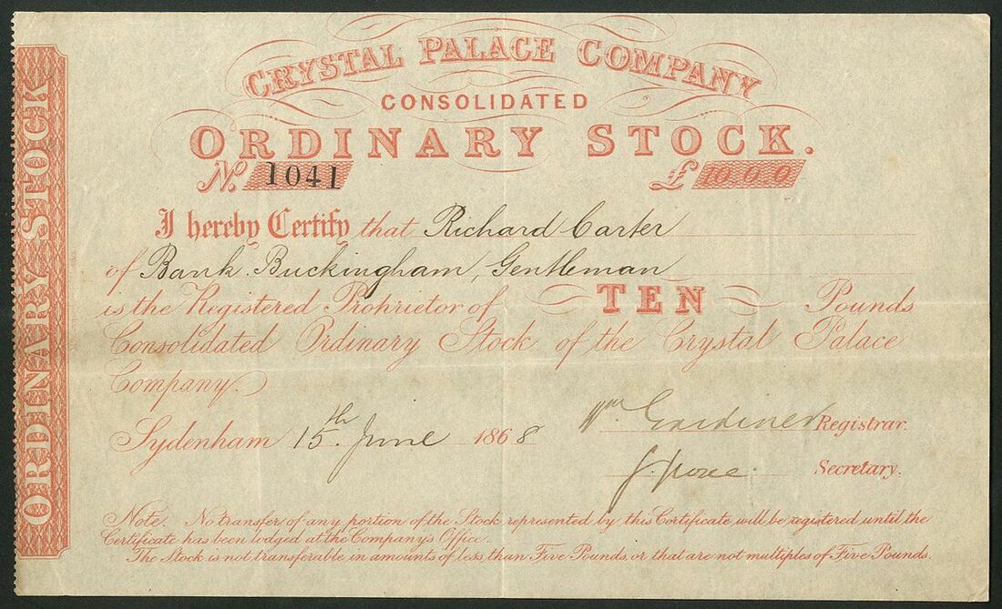 Great Britain: Crystal Palace Company, consolidated ordinary stock certificate for £10, 186[8], #1041, red. Built for the Great Exhibition of 1851 in Hyde Park to the designs of Joseph Paxton. Dismantled and moved to Sydenham where it stayed until it was destroyed by fire in 1936. GVF.