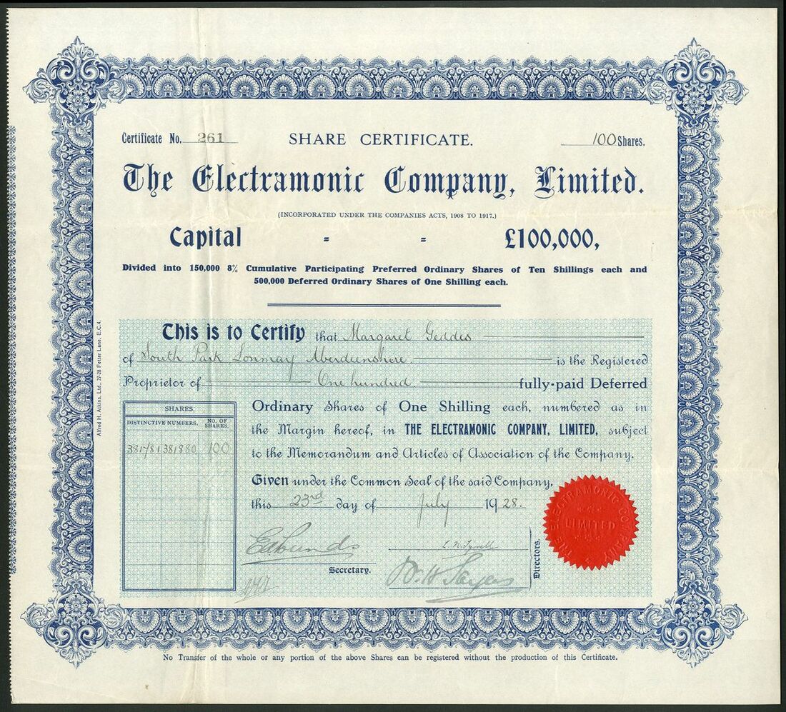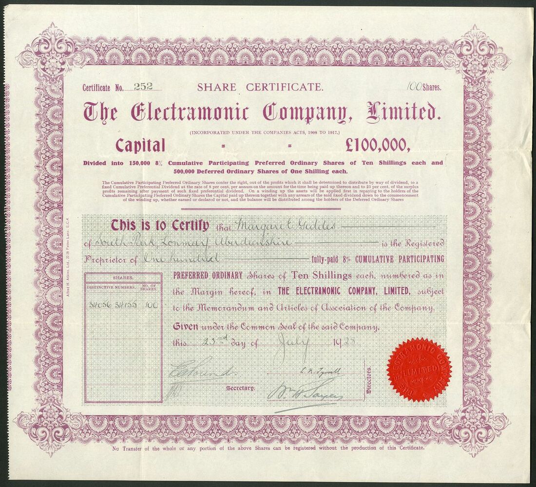 Great Britain: Electramonic Company Limited, pair of certificates for 8% Cumulative Preferred Ordinary shares and Deferred Ordinary shares, both 19[28], #252 and #261 respecively, together with Electramonic Company (1930) Limited, , Deferred Ordinary shares, 193[0], #311 and Electramonic (Foreign Rights) Limited, Ordinary shares, 19[28], #71. The company was formed in 1928 to manufacture gramophone records and sound reproduction equipment for films. The issue was heavily oversubscribed but the company failed and was reorganised in 1930. VF (4).