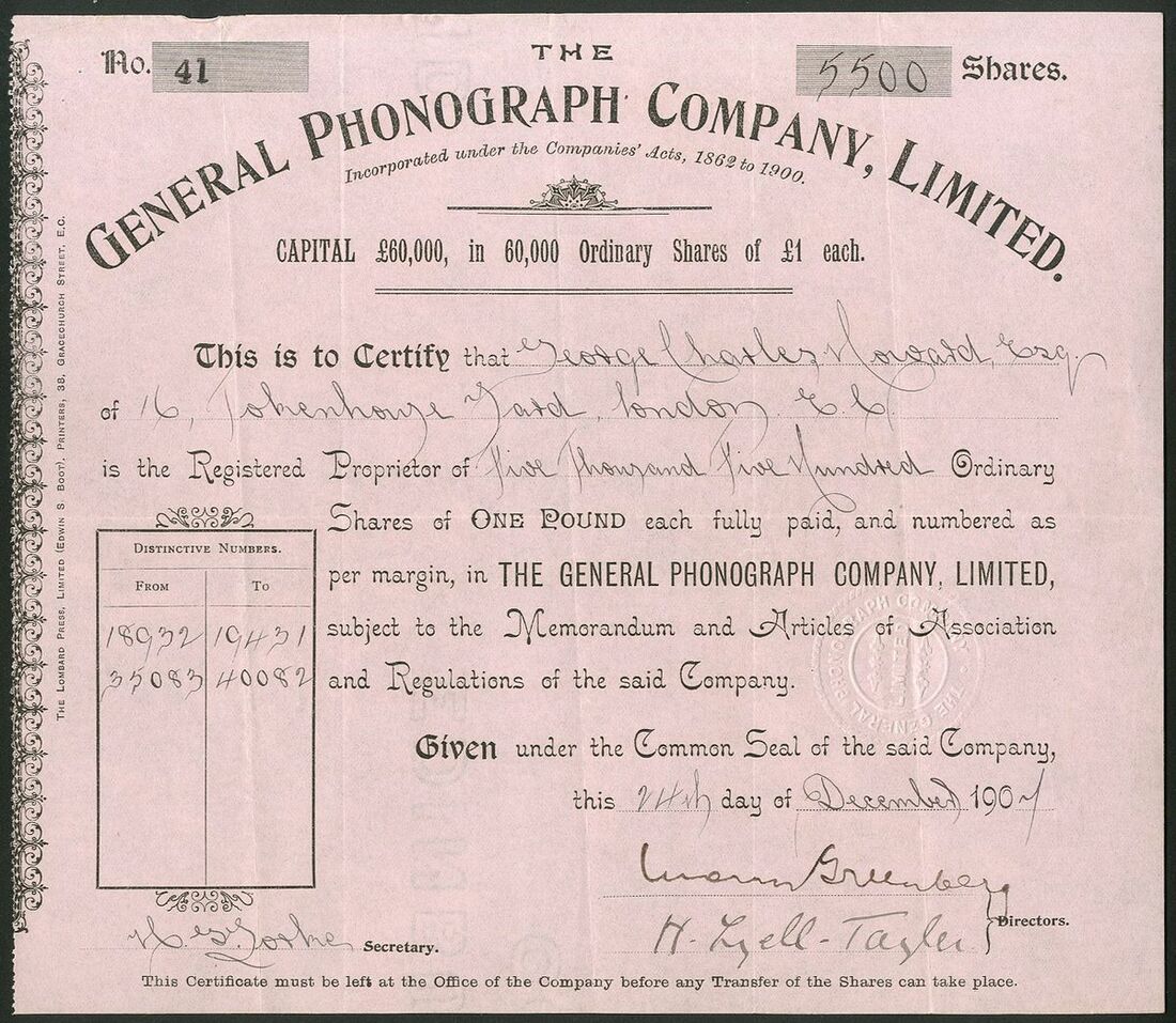 Great Britain: General Phonograph Company Limited, £1 shares, 190[7], #41, black on pink paper. Signed by well known conductor and musical director H. Lyell Thomas. VF and scarce early phonograph company.