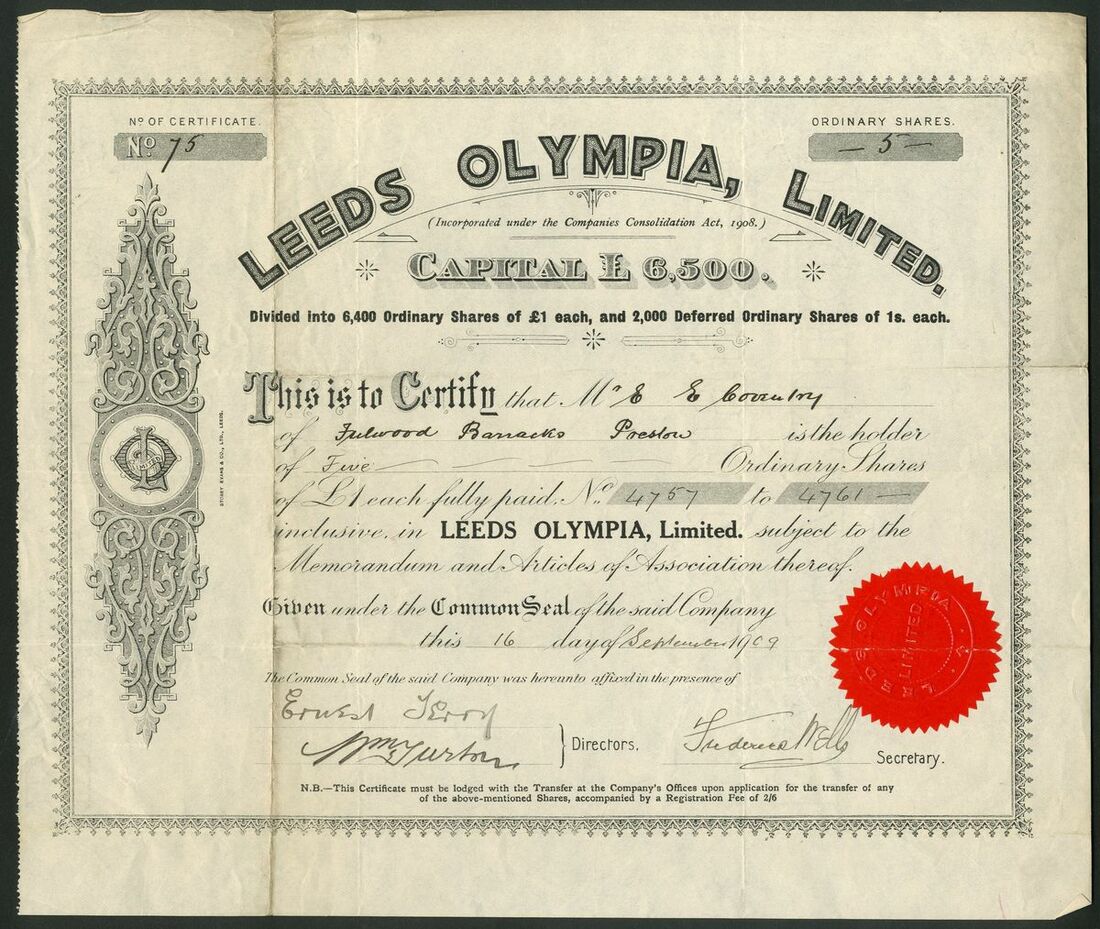 Great Britain: Leeds Olympia Limited, £1 ordinary shares, 19[09], #75, scrollwork at left, black, red seal. This was one of the finest roller skating rinks built at the start of the craze that saw some 500 rinks built around the country by 1909. By 1912 the craze was in decline and the Olympia began to host music and sporting events especially some world class boxing matches. At the outbreak of WWI Blackburn Aviation needed more space to build aircraft and the Olympia was acquired for the purpose. Interestingly the works remained known as the Olympia for some years. VF.