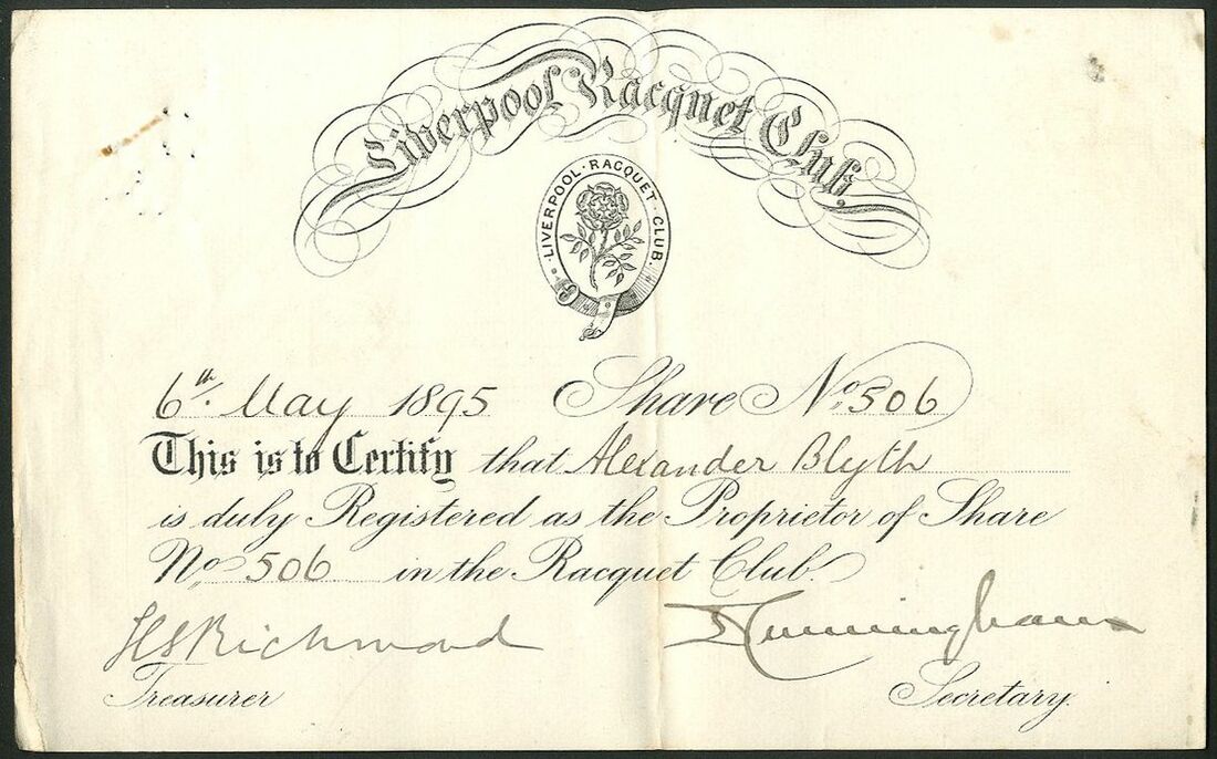 Great Britain: Liverpool Racquet Club, one share, 18[95], #506, arms in centre, black. A gentlemans' club founded in 1874 for real tennis and other racquet sports. Facilities were improved by the addition of a dining room, billiards room and a bowling alley. The latter was converted in 1894 into fives courts. The building was damaged during WWII and in 1981 it was destroyed by the Toxteth riots. The club moved to the Hargreaves Building in Chapel Street shortly afterwards but the club ceased in 2001, the building becoming the Racquet Club Hotel. VF and rare.