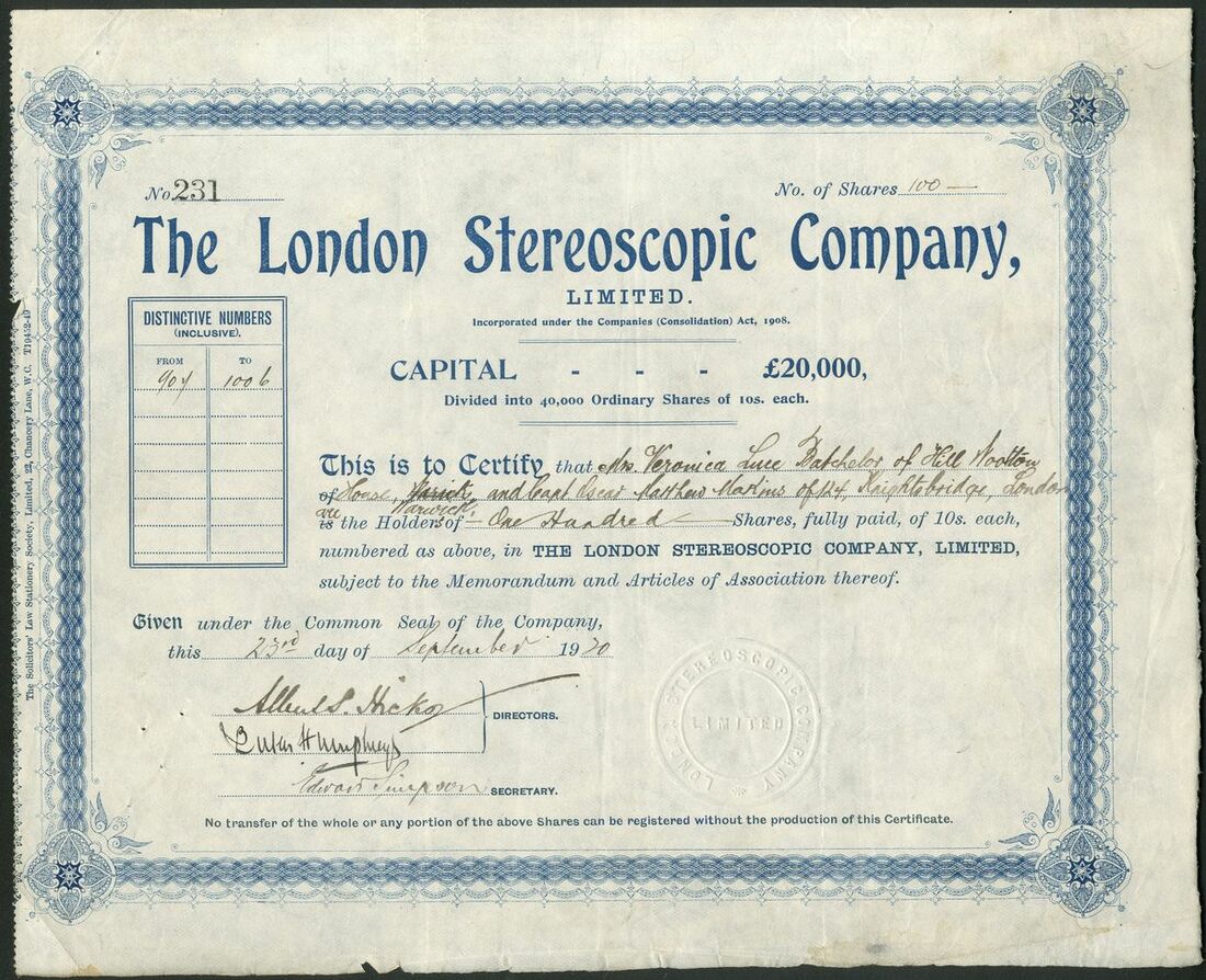 Great Britain: London Stereoscopic Company Limited, 10/- shares, 19[20], #231, blue. The company began as a partnership in 1854 and was first incorporated in 1885 as the London Stereoscopic and Photographic Company Ltd and reconstructed in 1912 as above. The foremost company in the UK offering popular steroescopic cards during the Victorian boom. VF and scarce.