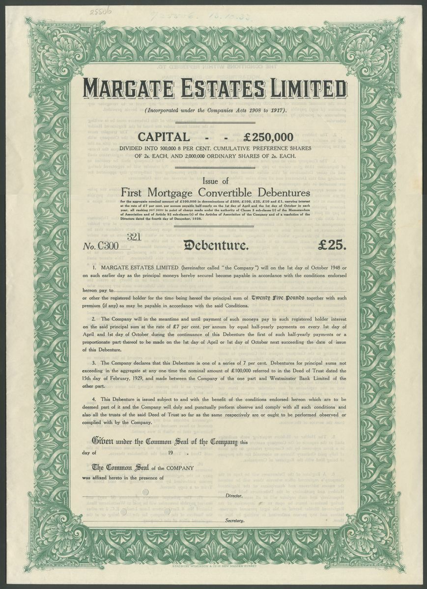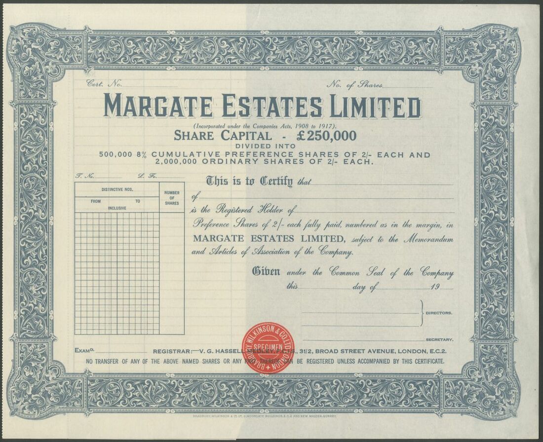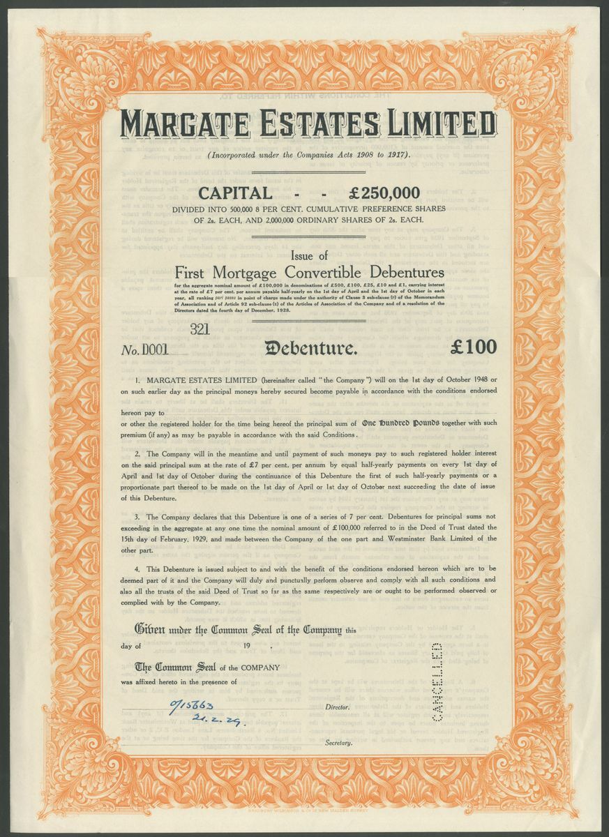 Great Britain: Margate Estates Limited, a series of specimen certificates from the Bradbury, Wilkinson archive, all circa 1929, comprising preference shares, grey/blue, and debentures for £1, red, £25, green and £100, orange. The company was liquidated in 1933 and merged with the Clifton Baths Margate, owners of the Baths and the Dreamland Amusement Park. Generally EF (4).