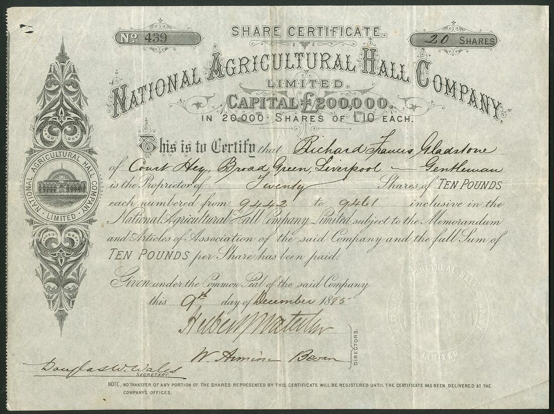 Great Britain: National Agricultural Hall Co. Ltd., £10 shares, 18[87], #439, sgned by Herbert Waterlow as director, vignette of the building in scrollwork at left, black, printed by Waterlow, Bros & Layton. Opened in 1886 this was the largest covered exhibition centre, the iron framed roof being built by Andrew Handyside. The name was quickly changed to Olympia and the first show, the Hippodrome Circus was folowed by an exhibition of sporting dogs by Charles Cruft! Has hosted Barnums 'Greatest Show on Earth', The Ideal Home Show and the Motor Show. Still in use of course! VF and very rare, debentures are better known.