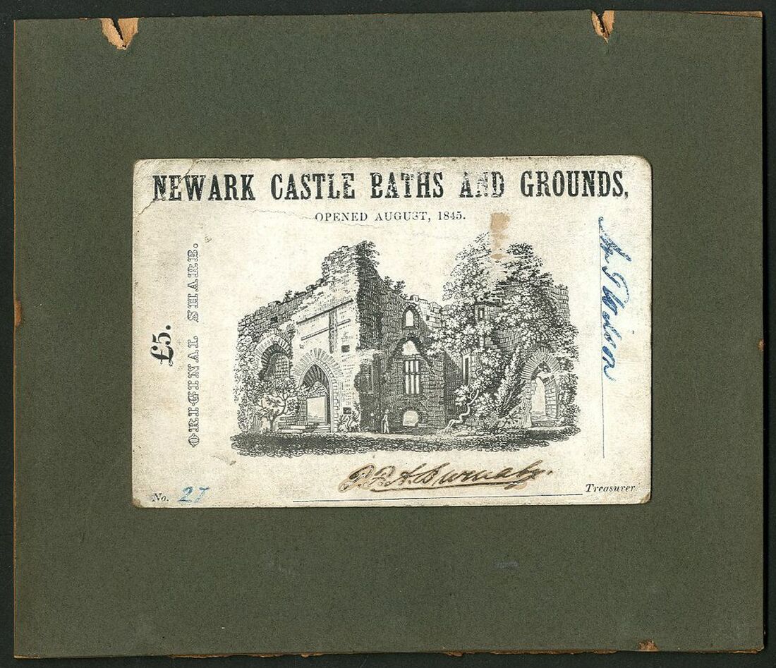 Great Britain: Newark Castle Baths and Grounds, £5 original share, undated but circa 1845, #27, small format in the form of a membership card, black, on porcelain coated card, vignette of the castle in centre. 12th century ruin that became famous for its part in the English Civil War after which it was destroyed by order of Parliament. A public baths was opened in the ground in August 1845 to which this piece relates. F-VF and rare.