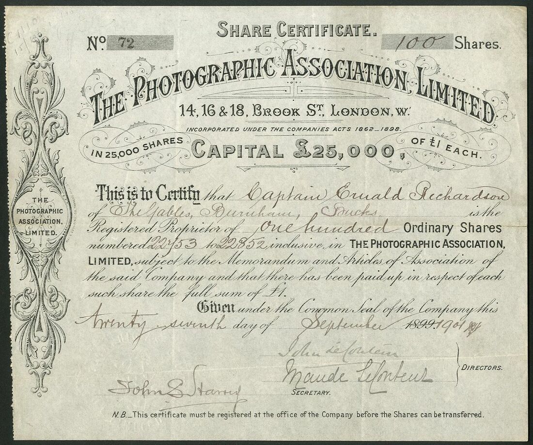 Great Britain: Photographic Association Limited, £1 ordinary shares, fully paid, 1899[1901], #72, signed by John le Couteur and his wife Maude as directors, black. Following the creation of this company in 1894, Le Couteur obtained a license to deal with Gaumont film equipment and also experimented with early film, shooting several reels of Queen Victoria's Diamond Jubilee celebrations. As a businessman he was not so good and after losing the Gaumont license he and his wife commited double suicide at the company's offices in Hannover Square, London in 1905. VF and rare.