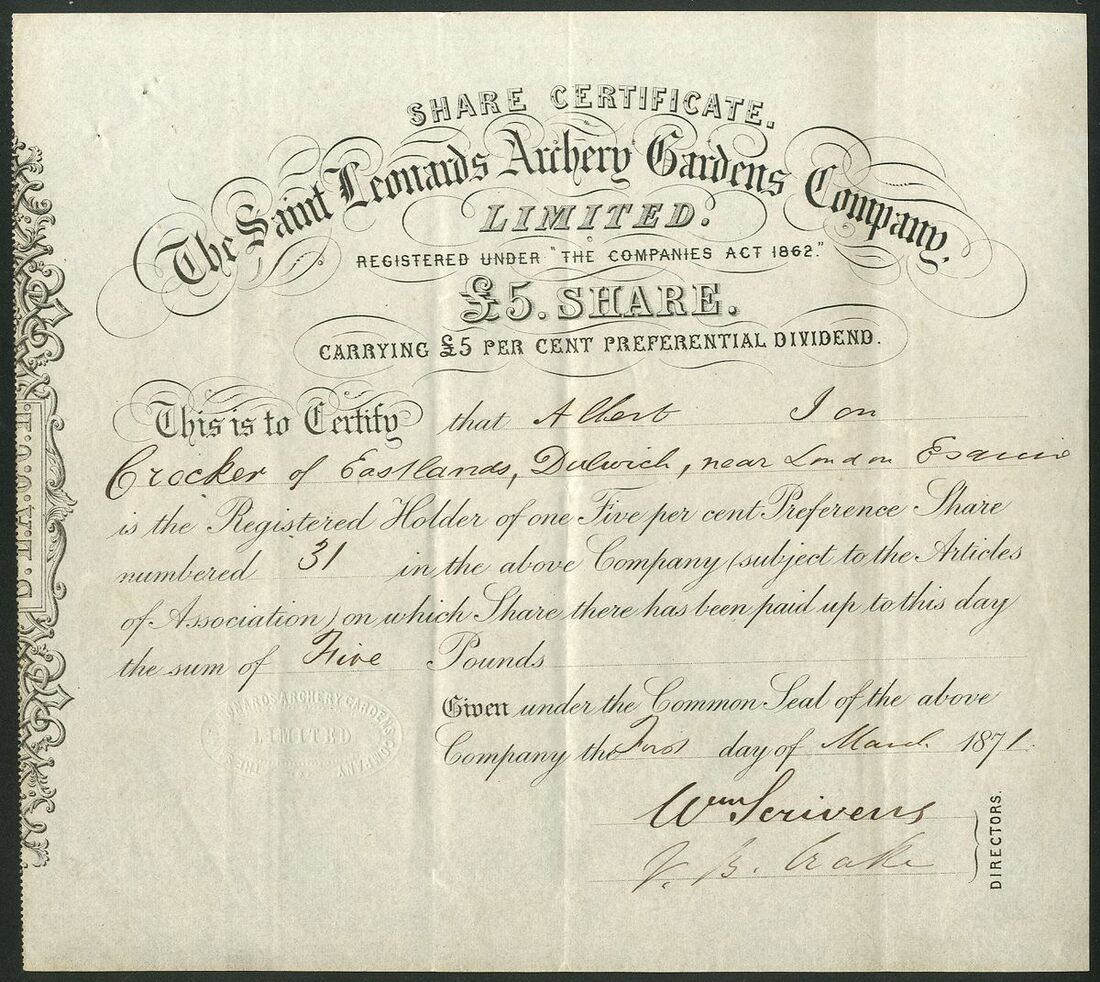 Great Britain: Saint Leonards Archery Gardens Company Limited, £5 share, 187[1], #31, black. Registered 1865 to take over the Archery Gardens in Saint Leonards, Sussex. The gardens were founded to host archery, golf and croquet competitions and could accommodate 2000 people. In financial difficulty by 1909 but extended to host tennis which overtook archery as the main sport. The Gardens were put up for sale in 1953 and later became Hastings College of Arts and Technology and now is a housing development. VF and rare.