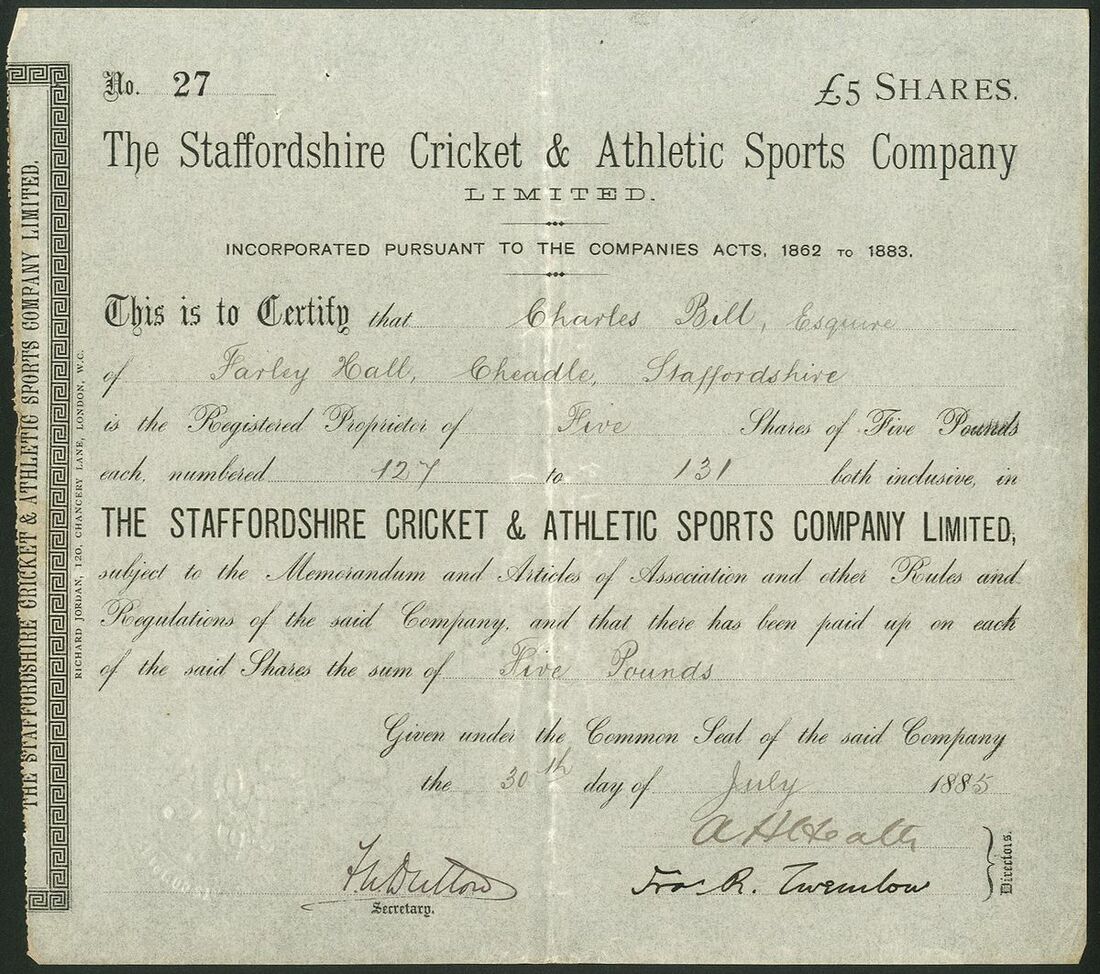 Great Britain: Staffordshire Cricket & Athletic Sports Company Ltd., £5 shares, 188[5], #27, black. Registered in 1885 to lay out grounds for county cricket alongside the North Staffordshire Railway Hotel in Stoke on Trent. Portions of the land were also used for tennis, football, fives and rackets. County matches were played there for many years until the grounds closed before WWII. VF and scarce.