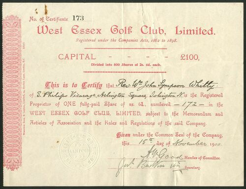 Great Britain: West Essex Golf Club Ltd., 2s 6d shares, 19[00], #173, red, printed by Waterlow Bros & Layton. The club was opened in 1900 as is now rated in the top 10 in Essex. Rust mark at top, VF and rare.