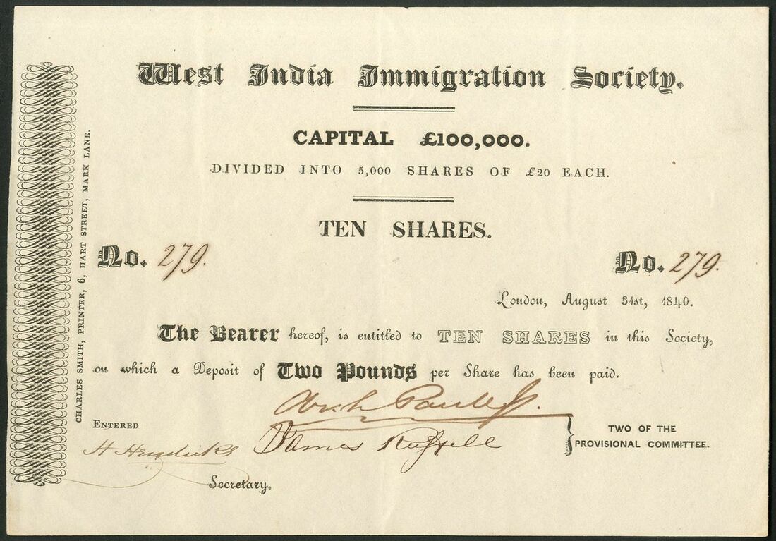 West Indies: West India Immigration Society, 10 shares of £20, £2 per share paid, London 1840, #279, small format, black. The company was formed to promote immigration to the West Indian plantations which had fallen into poor condition following the abolishment of slavery in 1838. Achieved some success but was wound up in 1847. EF.