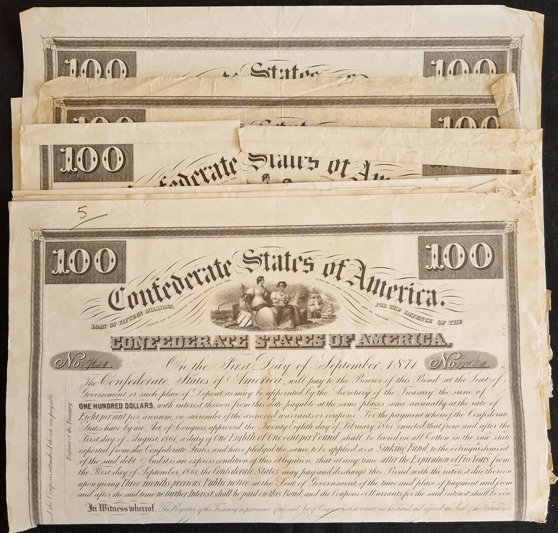 Confederate States of America: Act of February 28th 1861, 8% Loan, redeemable September 1871, a group of $100 bonds, thin paper (91) and thick paper (7), black (Ball 3 & 4), with coupons. Mixed condition, F-VF (8).