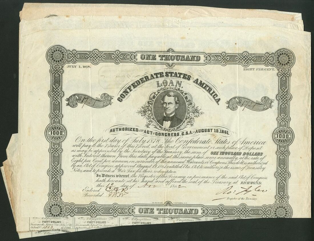 Confederate States, Act of August 19th 1861, 8% Loan, redeemable July 1878, a group of 4 bonds for $1000, Memminger (Ball 118), with coupons. F- VF (4).