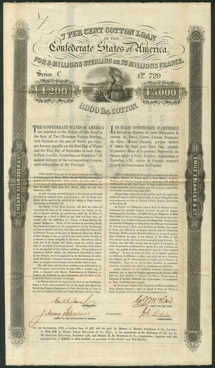 U.S.A: Confederate States: Act of January 29th 1863, 7% Cotton Loan, bond for £200 or F5000, #C729, 8000lbs Cotton, signed by Emile Erlanger & Co. as contractors, allegorical female with flag and bales, text in English and French, black, orange-brown underprint to coupons. (Ball 156). GVF.