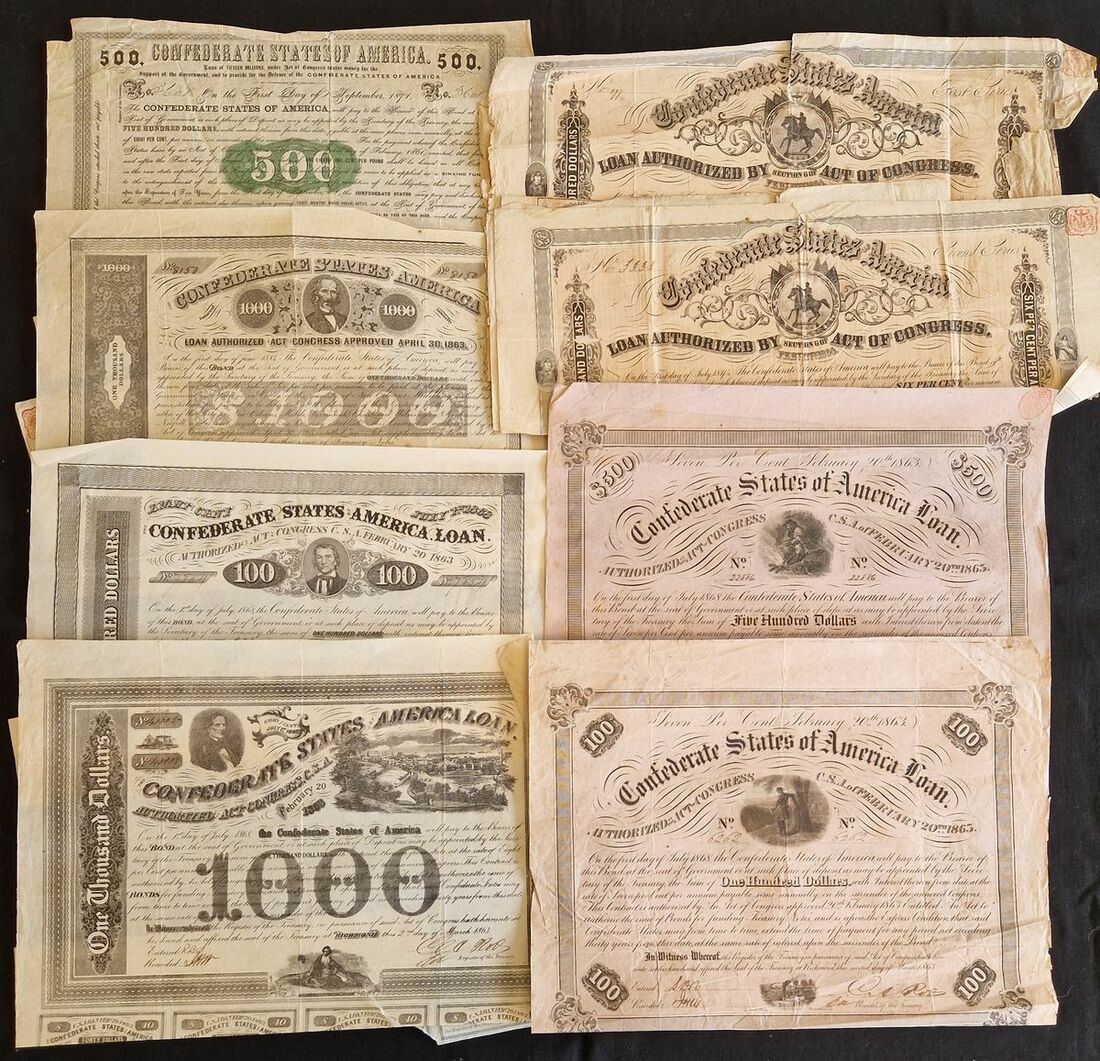 Confederate States: A group of different bonds (8), in mixed condition. Comprises Ball 7, 165, 201, 212, 221, 280, 304 and 323. See images for more details. F-VF (8).