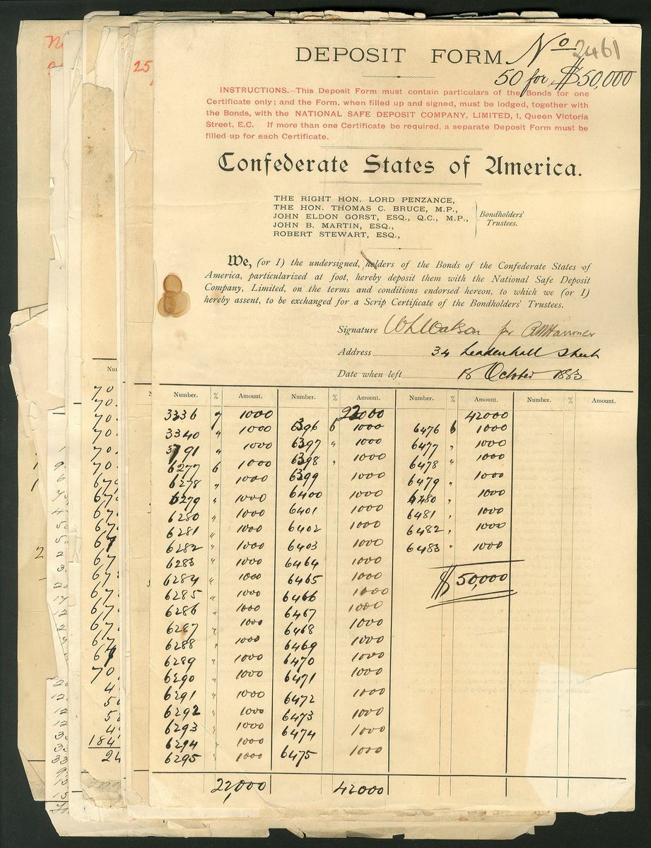 Confederate States: a group of 20 Deposit Forms, used in the 1880's in the United Kingdom by Bondholders Trustees to try to obtain payment of the bonds from the United States. Black and red printing. Very mixed condition, poor to AVF (20).