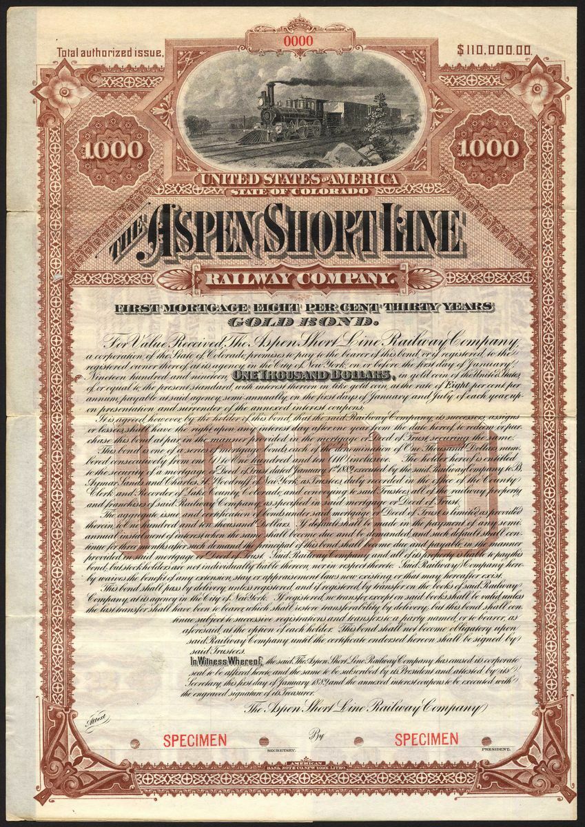 U.S.A.: Aspen Short Line Railway Co. (CO), SPECIMEN first mortgage 8% 30yr gold bond for $1000, printed by the American Bank Note Co., steam train at top, ornate border, brown and black. Small tears on folds at left and right, AVF. Only known as a specimen and we understand this is the only example.