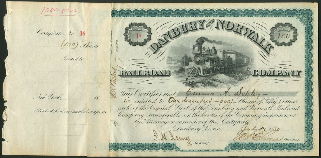 U.S.A.: Danbury and Norwalk Railroad Company, $50 shares, 188[0], #18, steam train at top, green and black, cancelled and counterfoil reglued at left. GVF.