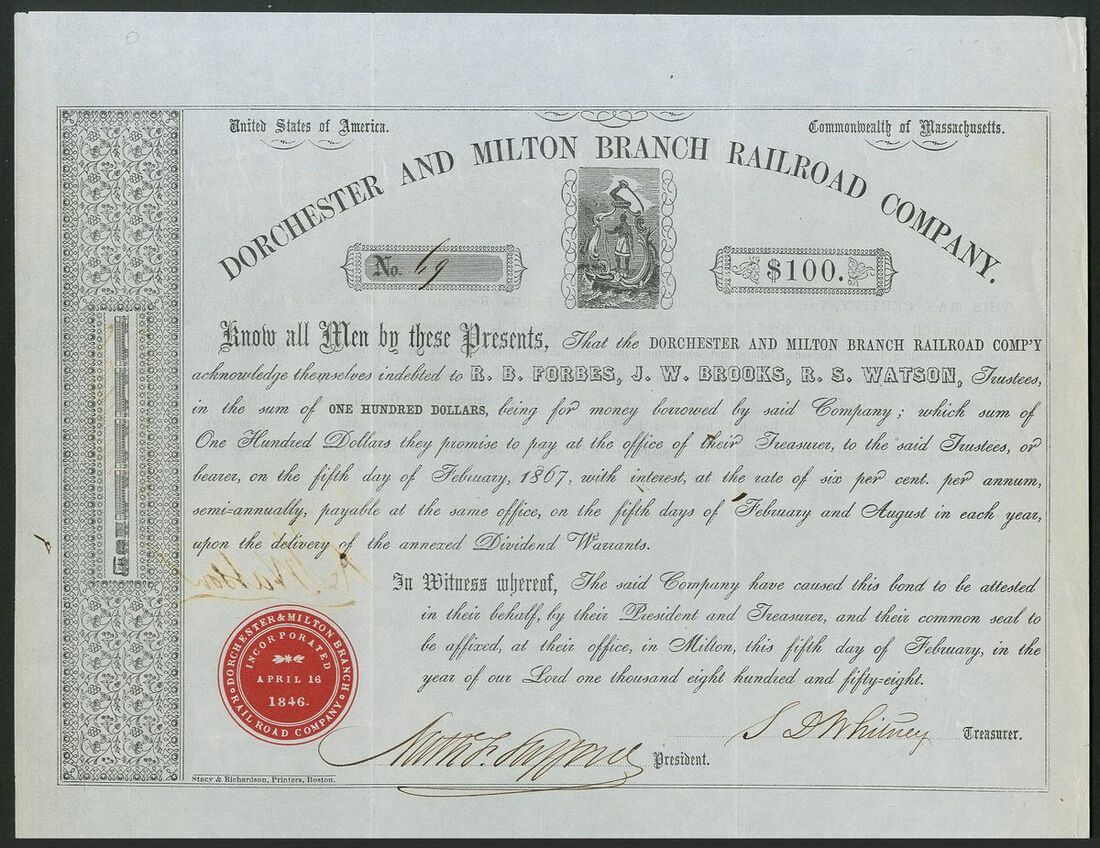 U.S.A.: Dorchester and Milton Branch Railroad Company, 6% bond for $100, 1858, #69, black on greyish paper, with coupons. GVF.