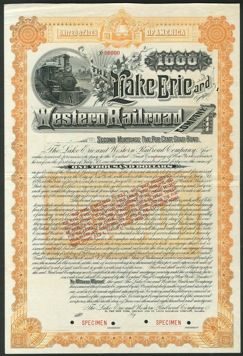 U.S.A: Lake Erie and Western Railroad Co., Second Mortgage 5% Gold Bond, 1891, $1000, a specimen printed by Homer Lee Banknote Co. with 1941 endorsement on face and New York, Chicago and St.Louis Railroad as the successor company, steam train top left, yellow and black, with coupons. VF-EF.