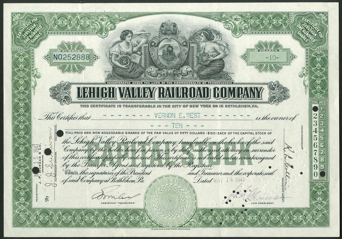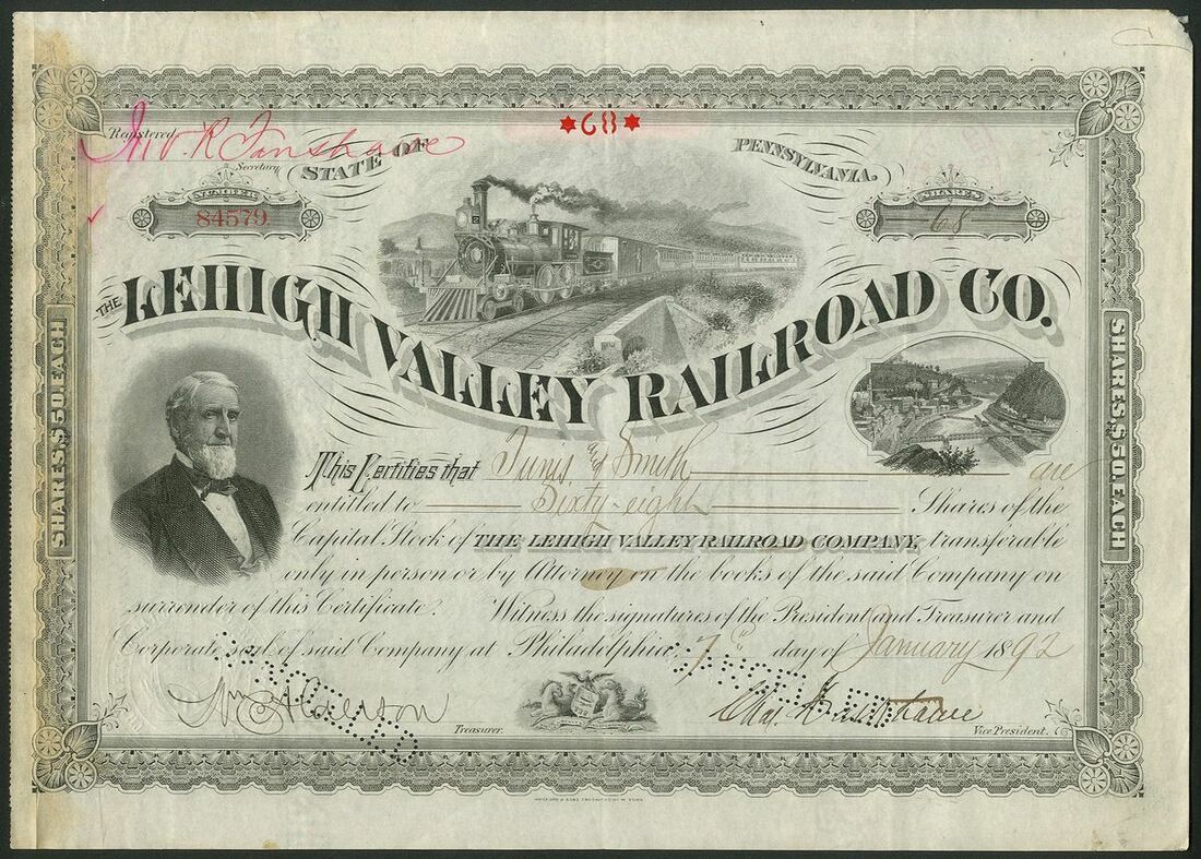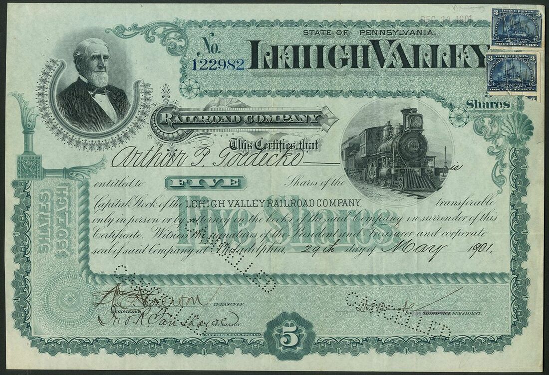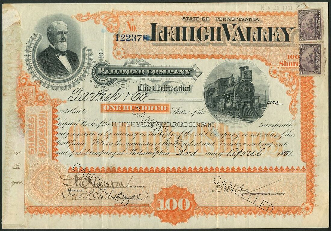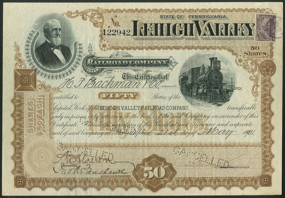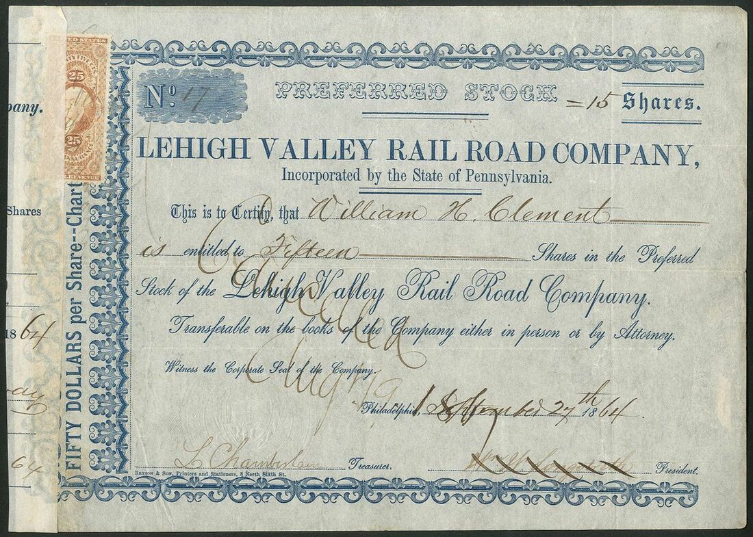 U.S.A.: Lehigh Valley Railroad Company, a series of certificates comprising [15] preferred shares, 18[64], blue; [18] shares, 18[92], black, 4 examples; 5 shares, 18[1901], green; 50 shares, 18[1901], brown; 100 shares, 18[1901], orange, and, less than 100 shares, [1941], green. All cancelled. Generally VF (9).