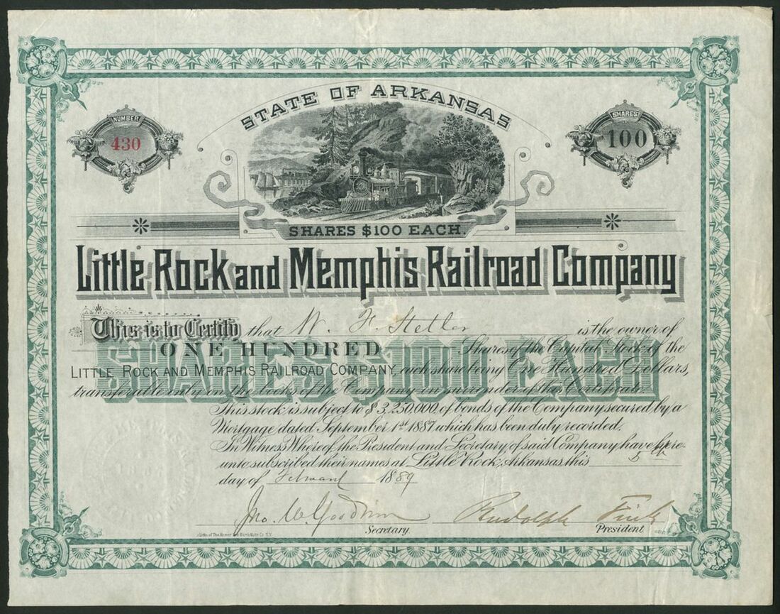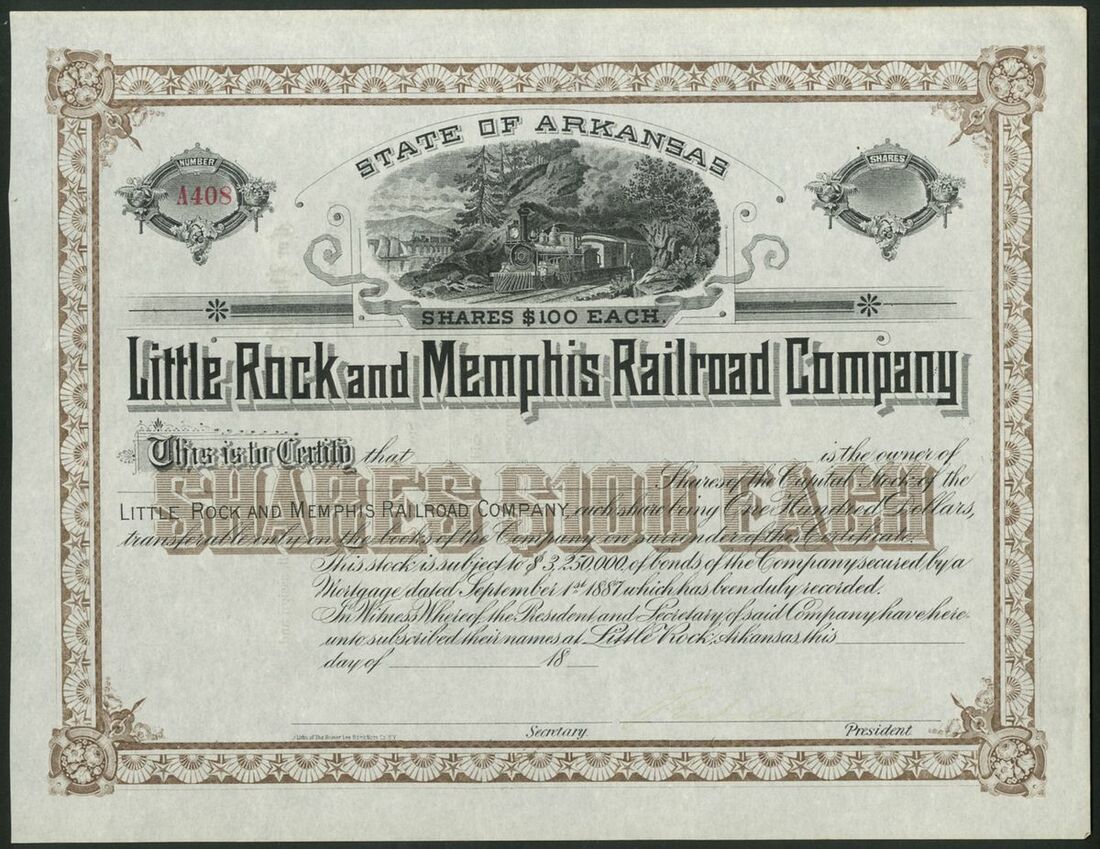 U.S.A.: Little Rock and Memphis Railroad Co., a pair of certificates for $100 shares, the first dated 18[89], #430, the second with very faded signature, no seal or date, train leaving tunnel at top, green and brown respectively. A long troubled line which was renamed a number of times before this reincarnation in 1887. GVF (2).