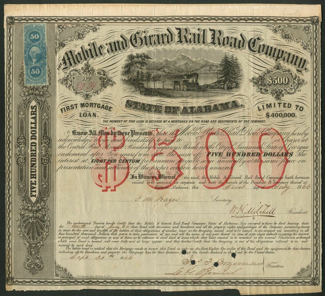 U.S.A.: Mobile & Girard Rail Road Co. (Alabama), First Mortgage bond for $500, 18[66], #89H, steam train passes lake, black, red $500 in underprint, blue adhesive revenue stamp, neatly cancelled. VF.
