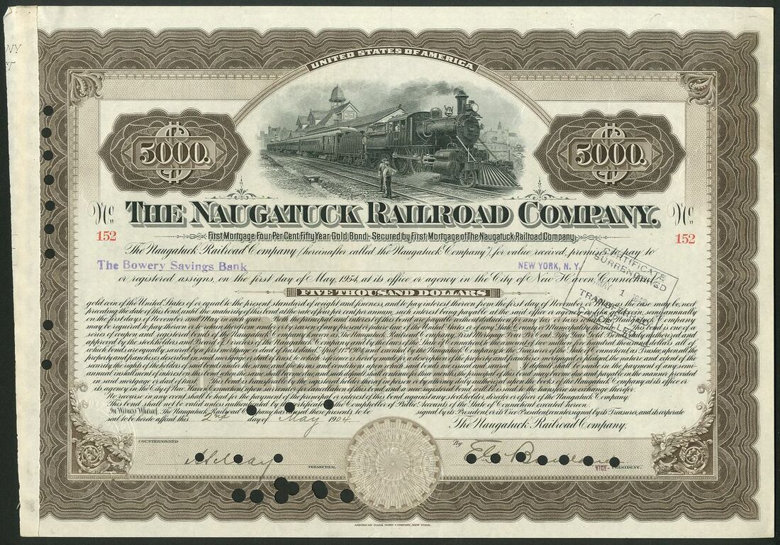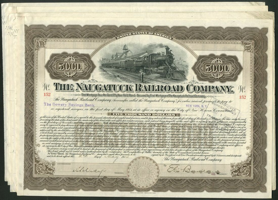 U.S.A.: Naugatuck Railroad Company, First Mortgage 4% 50-Year Gold Bond,a group of 5 registered bonds for $5000, all dated 19[04], #152, #164, #165, #168 and #169, steam train in centre, brown and black, hole cancelled, part counterfoil reglued at left. VF-EF (5).