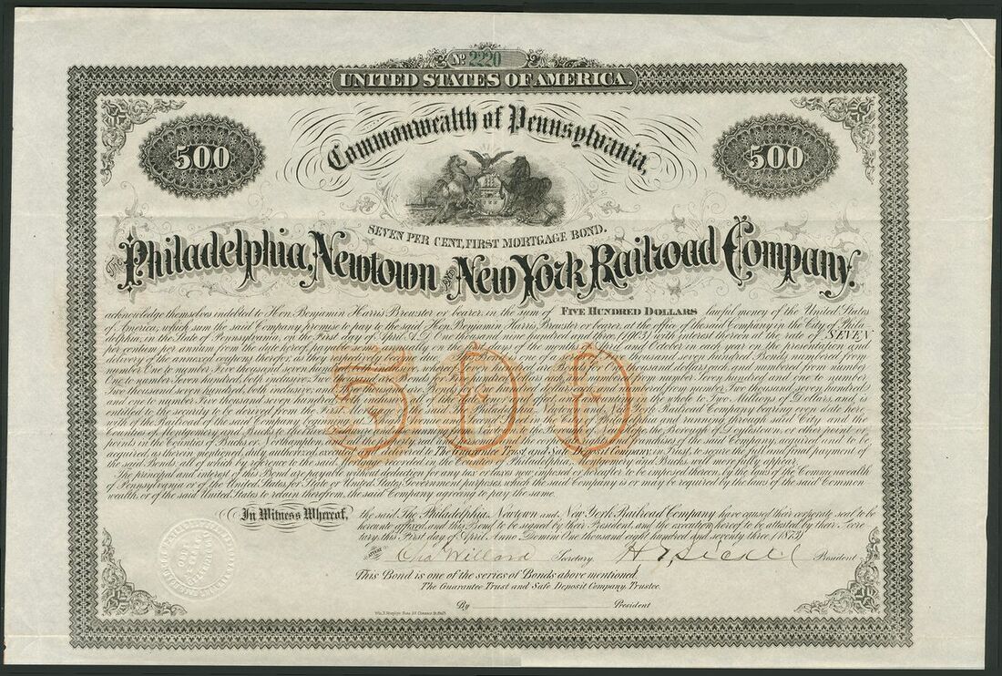 U.S.A.: Philadelphia Newtown and New York Railroad Co., 7% first mortgage bond for $500, 1873, #2220, signed by Horatio Gates Sickel as President, Pennsylvania state seal at top, ornate border, black with green underprint, complete with coupons. GVF.