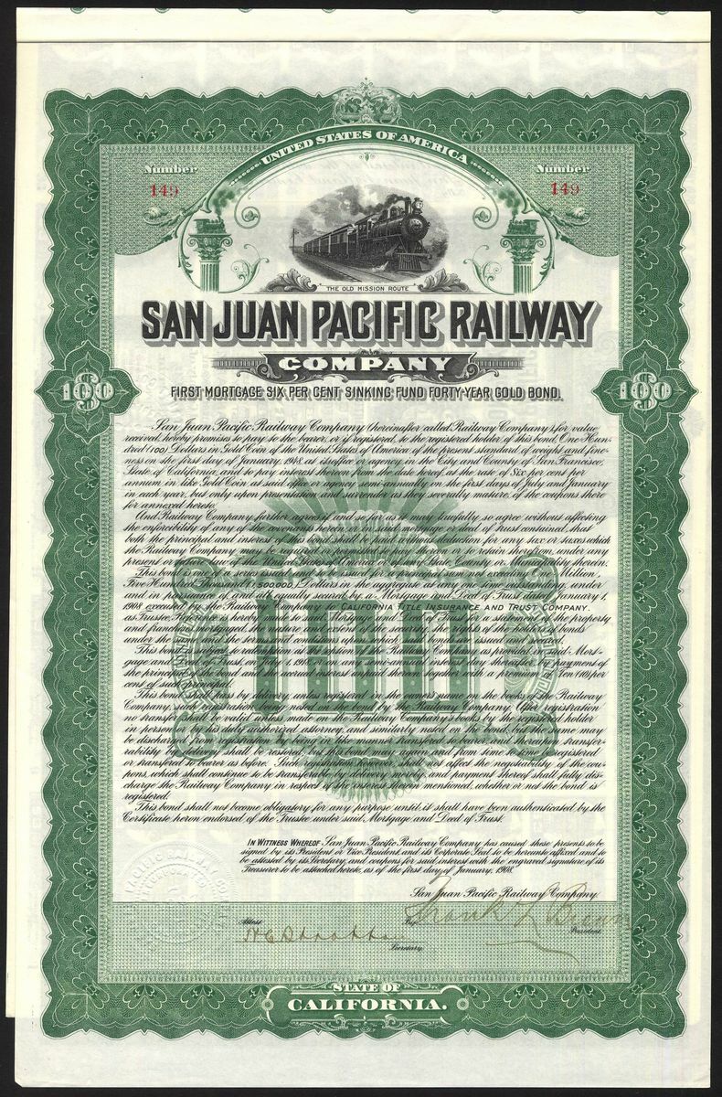 U.S.A.: San Juan Pacific Railway Co. (CA), first mortgage 6% sinking fund 40yr Gold Loan, 1908, pair of bonds for $100, #149 and $500, #1541, steam train at top, ornate borders, green and brown respectively, with coupons, NOT cancelled. EF. (2)