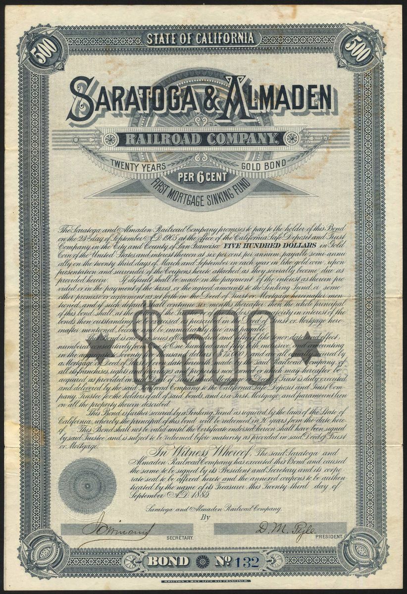 U.S.A.: Saratoga & Almaden Railroad Co. (CA), first mortgage 20yr 6% gold bond for $500, 1885, #132, of only 150 issued, ornate title and border, grey, with coupons, NOT cancelled. Some tone spots, VF and scarce.