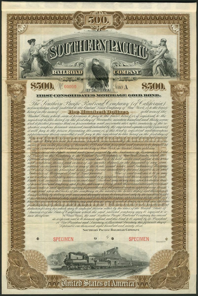 U.S.A.: Southern Pacific Railroad Company (of California), First Consolidated Mortgage Gold Bond, a specimen $500, 1893, from the ABNCo. archives, steam train at bottom, bald eagle and allegorical figures at top, brown and black, overprinted SPECIMEN in red and numbered 00000, with coupons. GVF and rare.