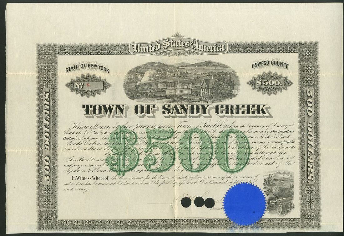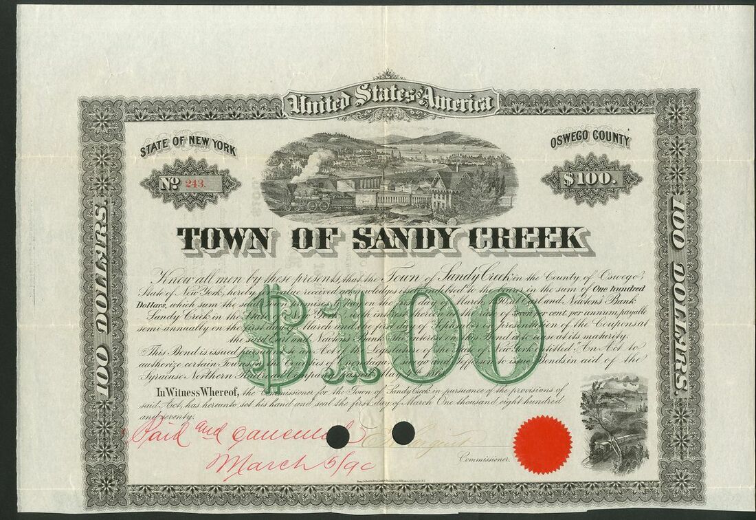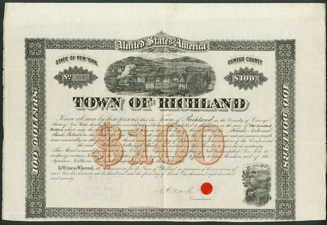 U.S.A.: Syracuse Northern Railroad, Town of Sandy Creek, New York, 7% bonds for $100 and $500, and Town of Richland, New York, 7% bond for $100, all issued in 1870 in aid of the Railway. All with steam train and town view, cancelled with no coupons remaining. All GVF (3).