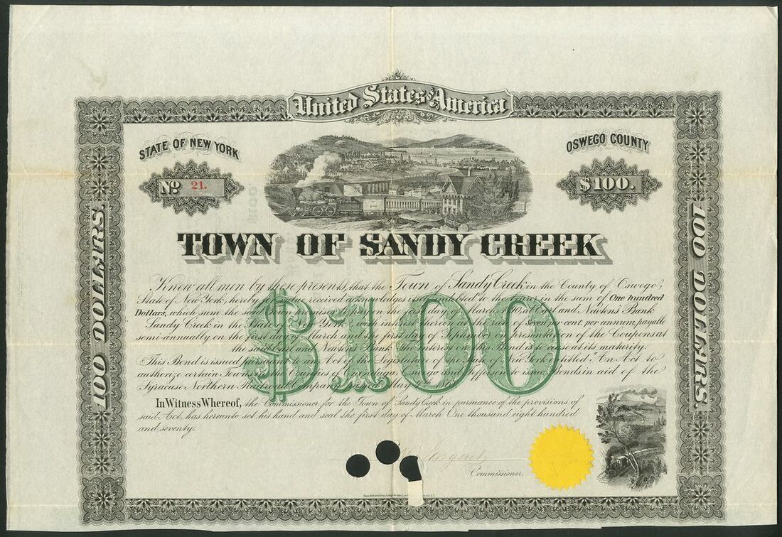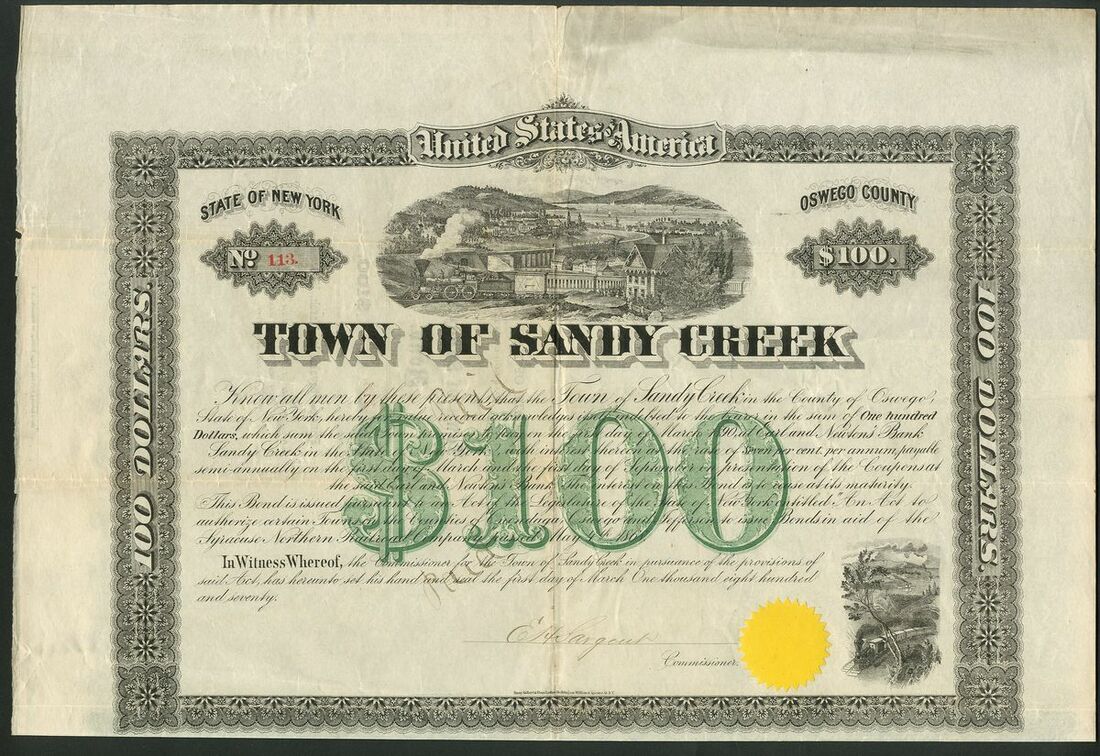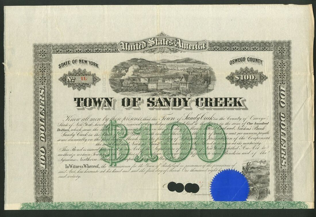 U.S.A.: Syracuse Northern Railroad, a group of bonds issued by the Town of Sandy Creek, New York in aid of the railroad, 1870. $100 bonds (11) and $500 bonds (3), steam train in centre, black with green underprint of denomination, all but 1 without coupons, cancelled. Mixed condition with minor splits along folds, F-AVF (14).