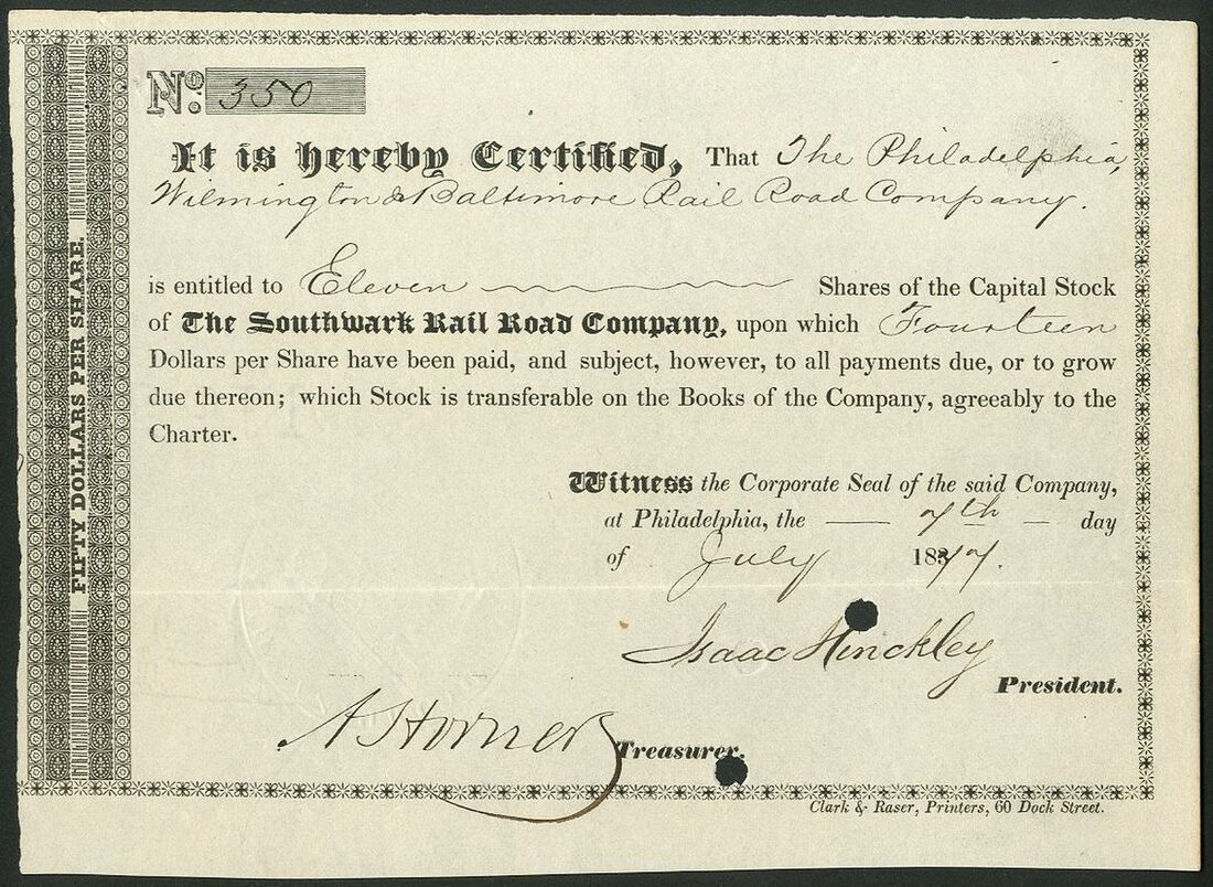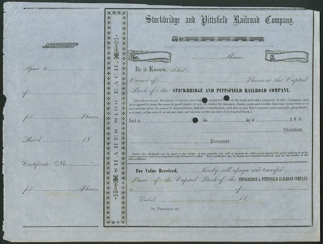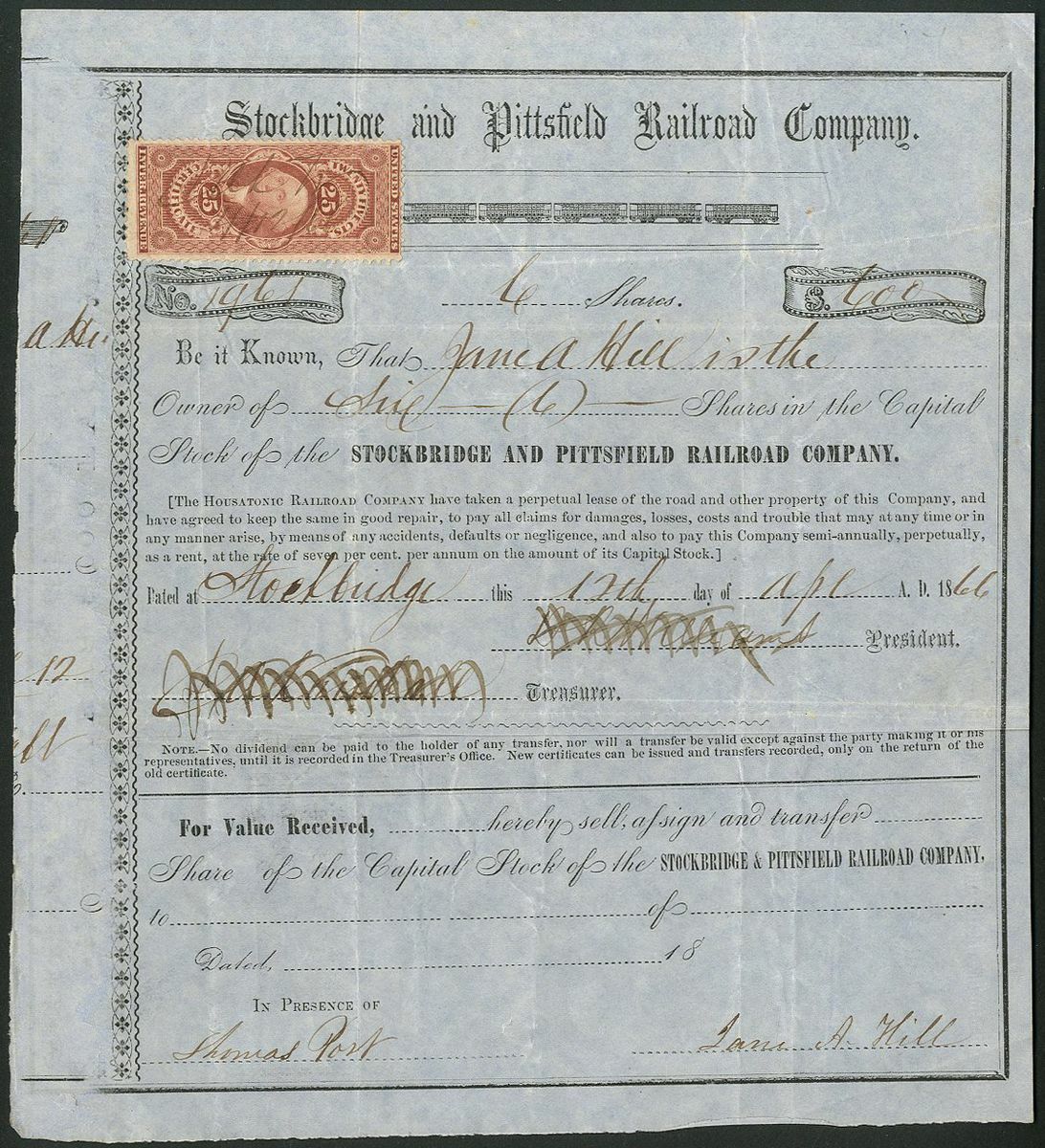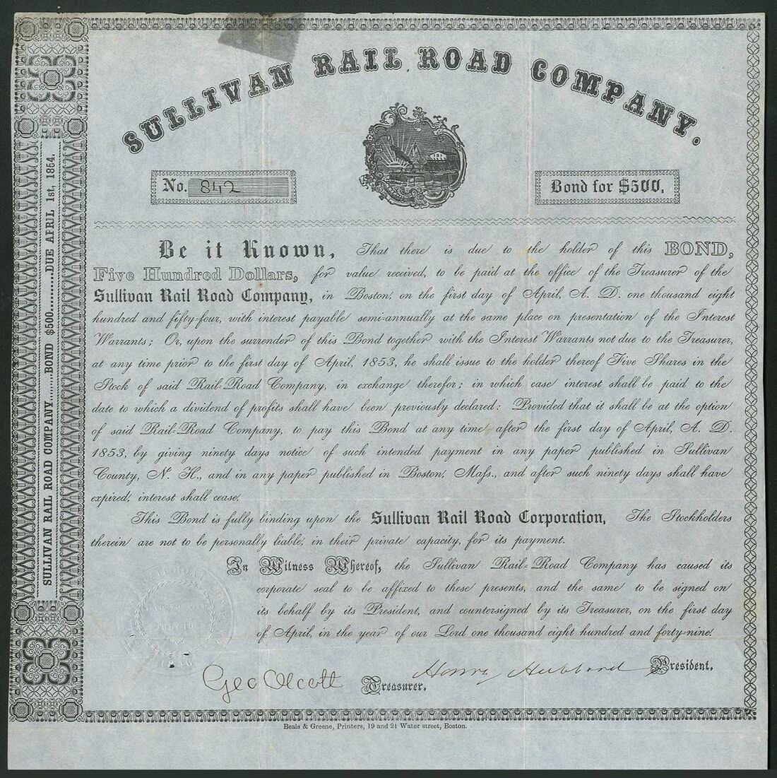 U.S.A.: Four railroad certificates, comprising Southwark Rail Road Company, 183[77], #350, black; Stockbridge and Pittsfield Railroad Company, 18[66], #1961, black on blue paper, plus an unissued example, and, Sullivan Rail Road Company, bond for $500, 1849, #842, black on blue paper. The last with small repair on top edge, the first two cancelled. The first rare. VF (4).