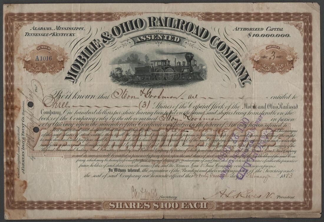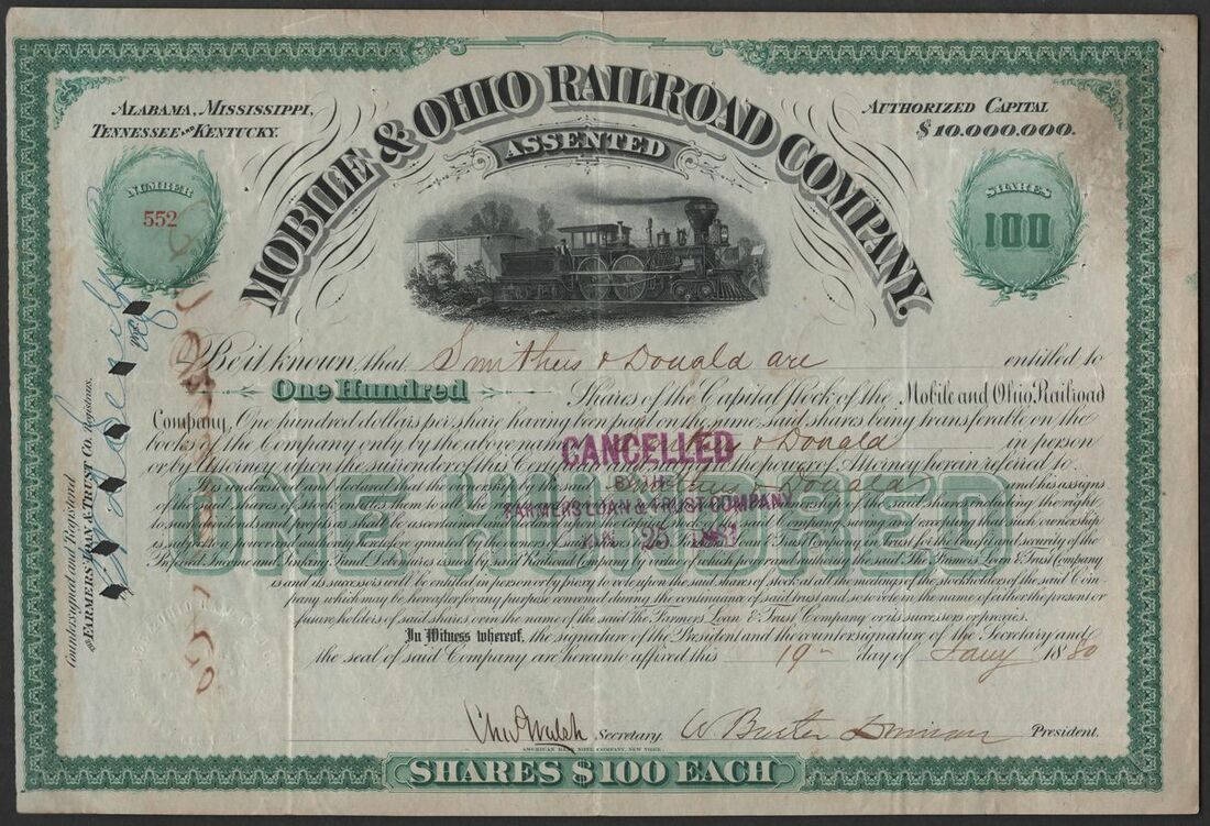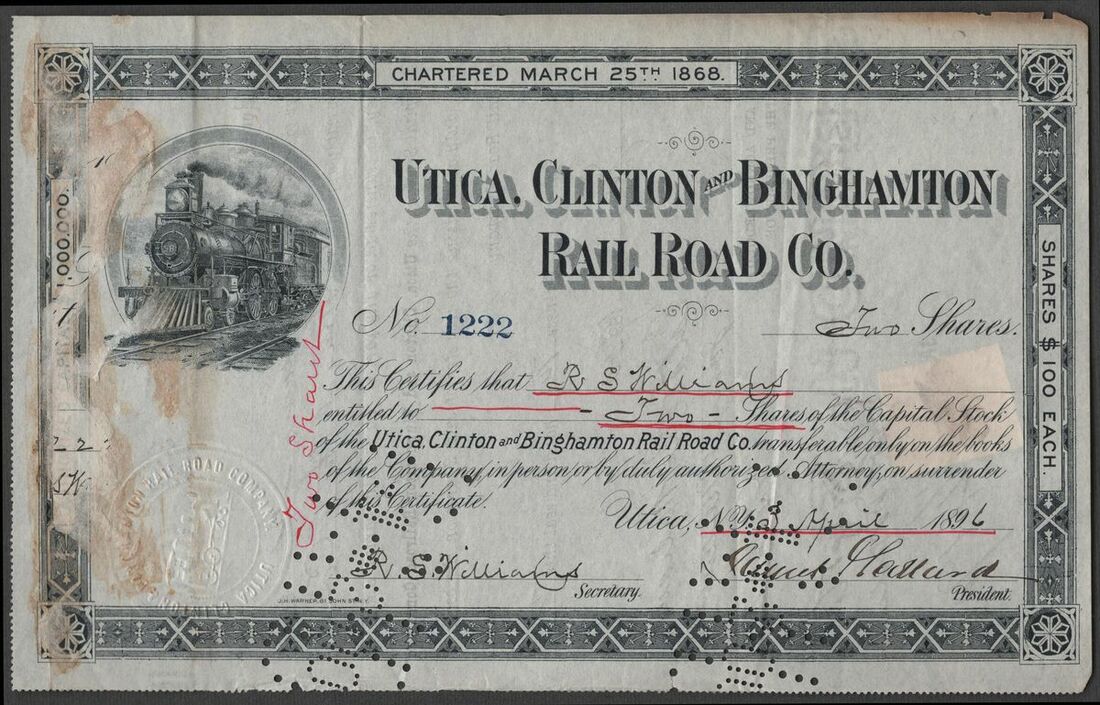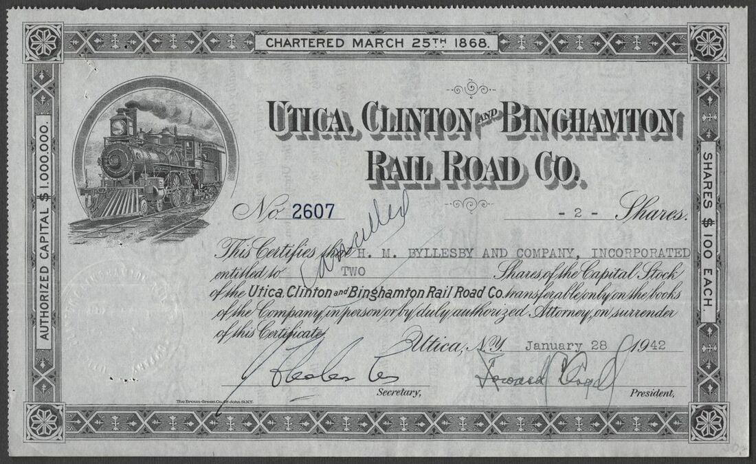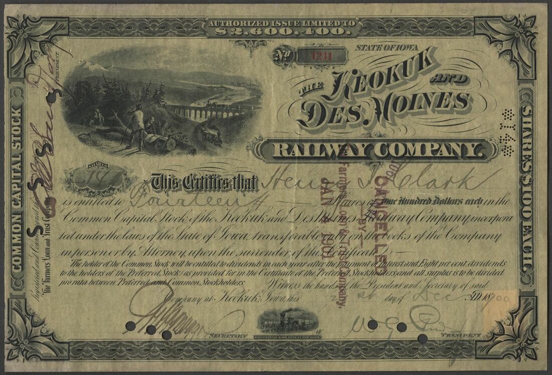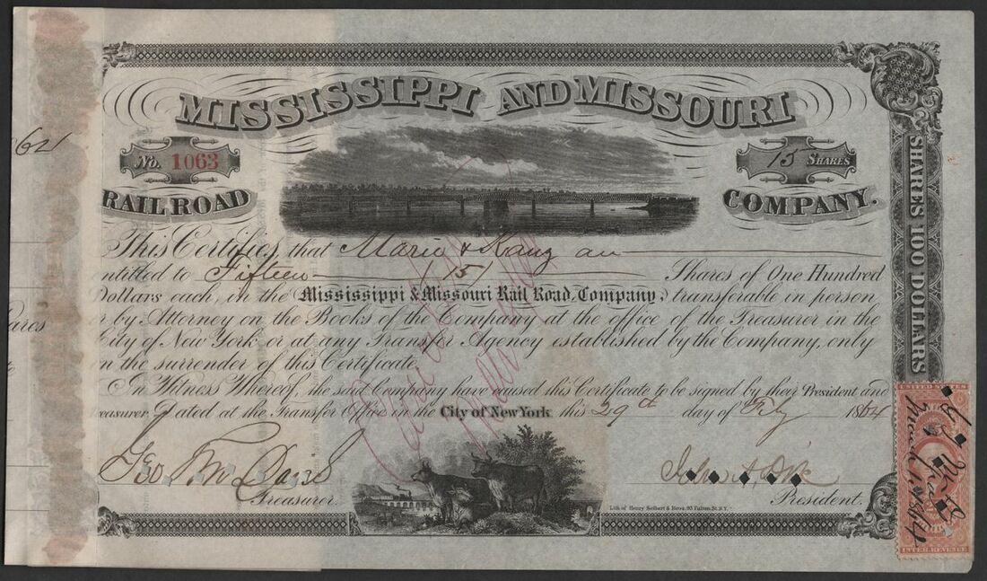 U.S.A.: A group of Railroad stock certificates, comprising Hartford and Connecticut Valley RR; Harlem River and Port chester RR;, Mississippi and Missouri RR; Keokuk and Des Moines Rly; Mobile & Ohio RR, 2 types; Western New York and Pennsylvania Railway; Utica, Clinton and Binghamton Rail Road, 2 types, and, others (6). Please see images for details. Most cancelled, Many VF and better (15).