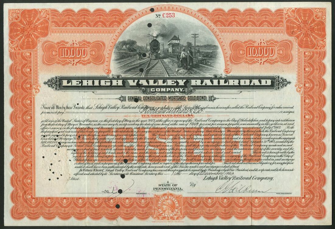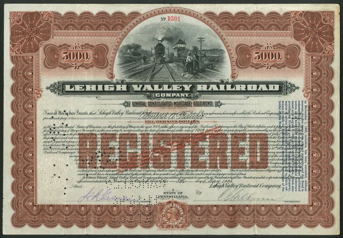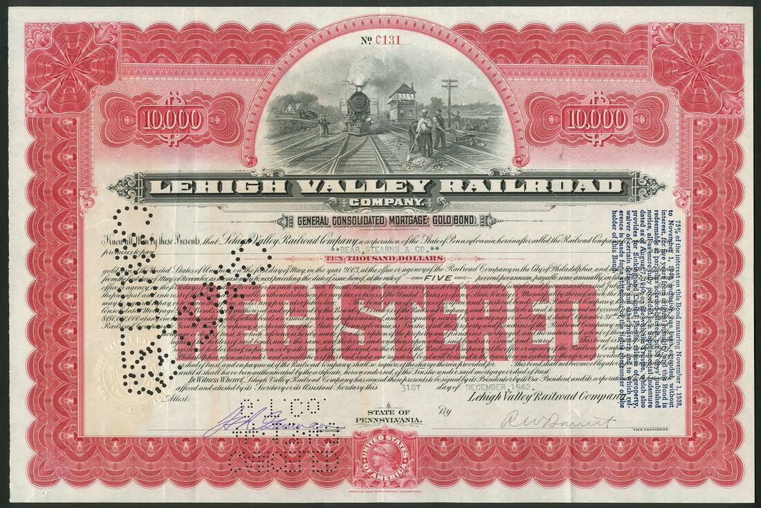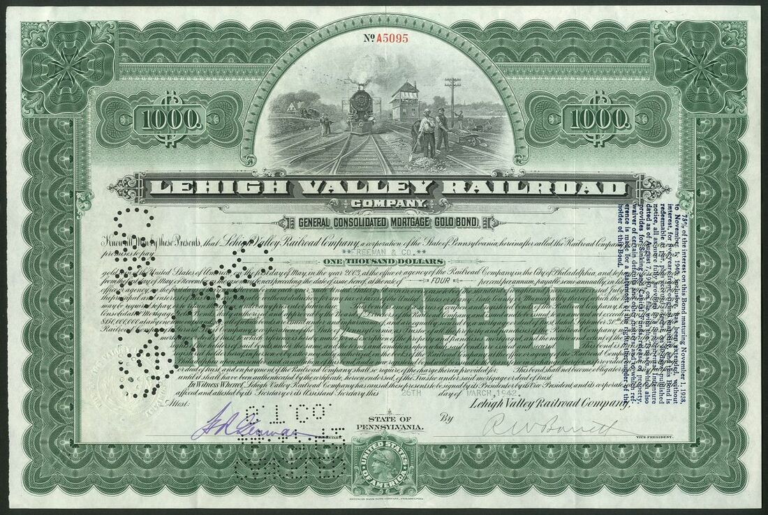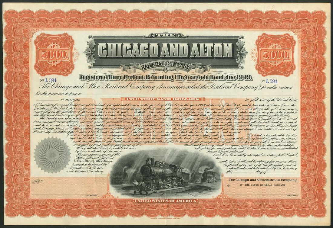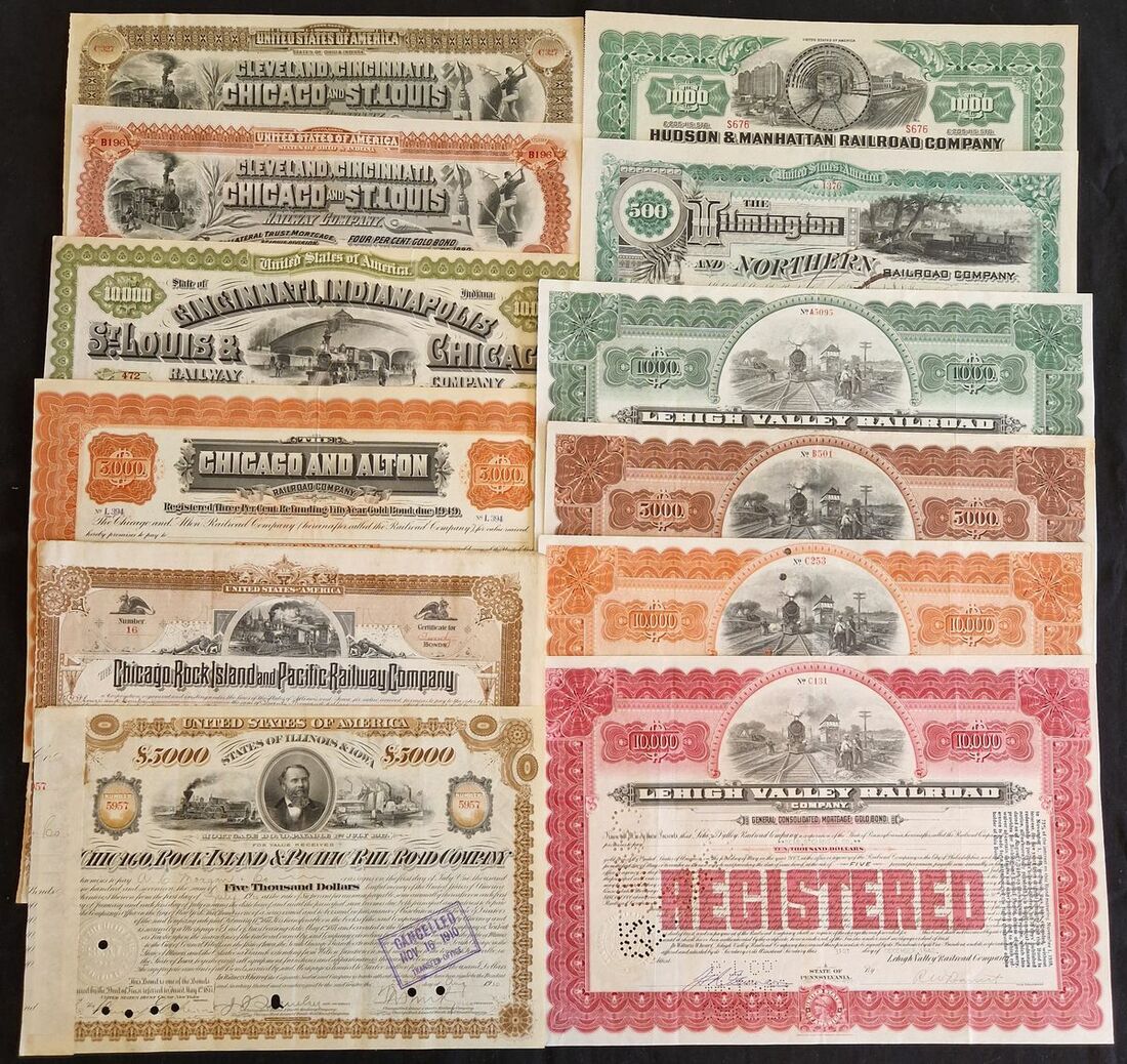 U.S.A.: A group of 12 registered Railroad bonds, both issued and unissued comprising Chicago, Rock Island & Pacific Rail Road Co., 2 types, 1890 and 1910; Chicago and Alton Railroad; Cincinnati, Indianapolis, St.Louis & Chicago Railway Co., $10,000; Cleveland, Cincinnati, Chicago and St.Louis Railway Co., 2 types, $5000 and $10,000; Hudson & Manhattan Railroad Co., $1000; Wilmington and Northern Railroad Co., $500, and, Lehigh Valley Railroad Company, 4 different types, 1929 to 1942. VF to EF (12).