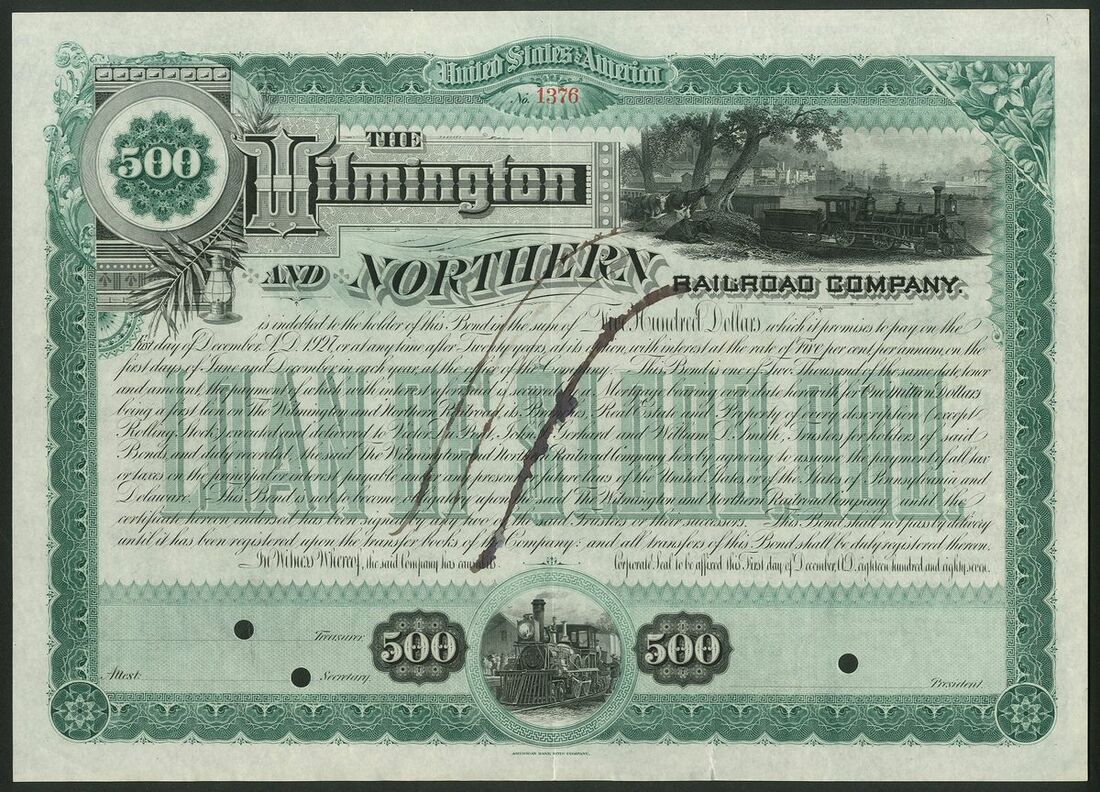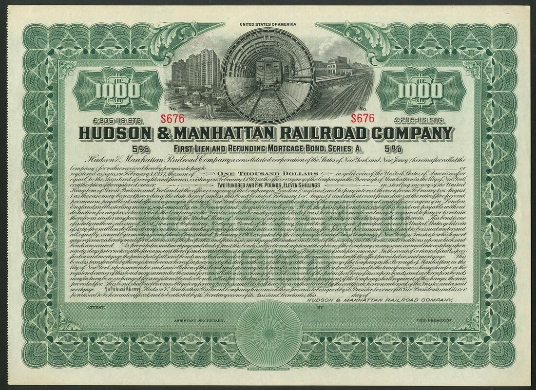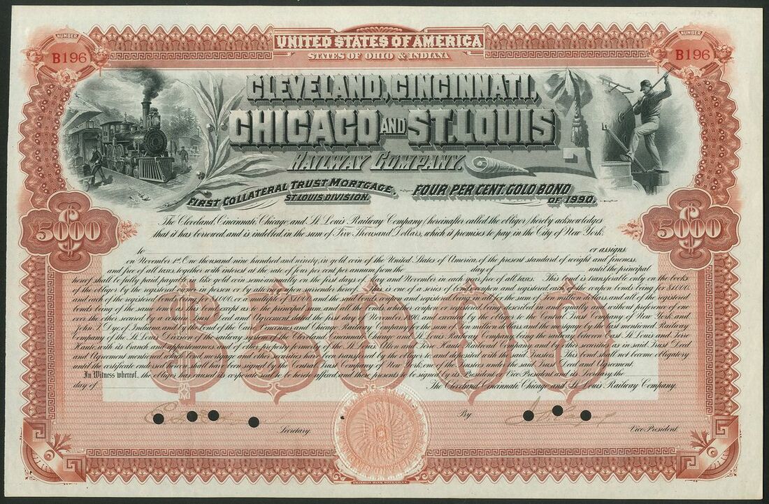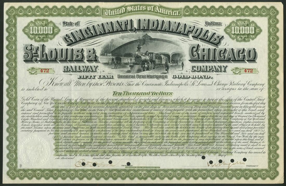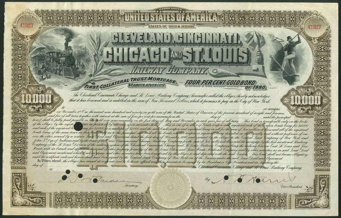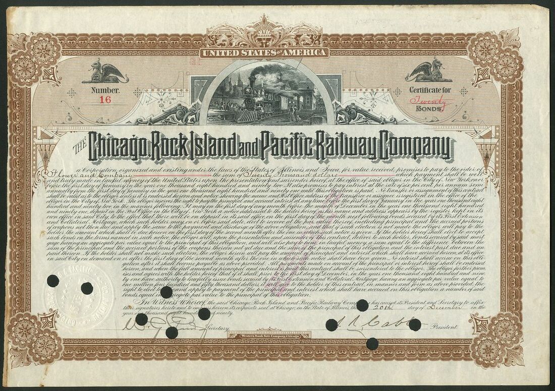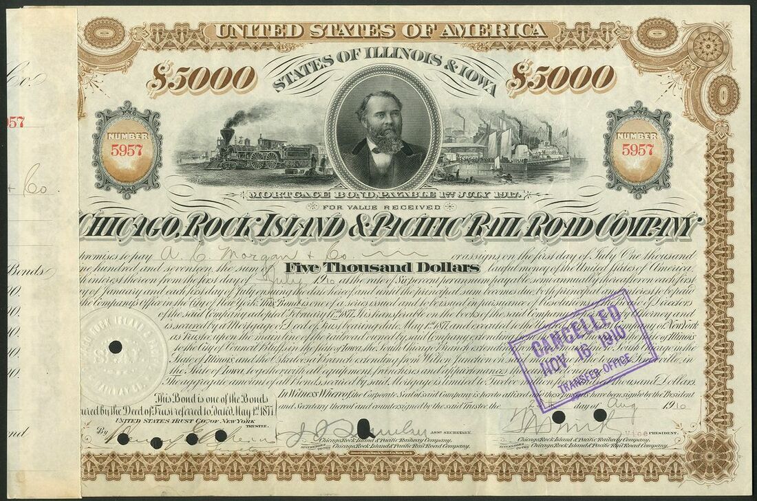U.S.A.: A group of 12 registered Railroad bonds, both issued and unissued comprising Chicago, Rock Island & Pacific Rail Road Co., 2 types, 1890 and 1910; Chicago and Alton Railroad; Cincinnati, Indianapolis, St.Louis & Chicago Railway Co., $10,000; Cleveland, Cincinnati, Chicago and St.Louis Railway Co., 2 types, $5000 and $10,000; Hudson & Manhattan Railroad Co., $1000; Wilmington and Northern Railroad Co., $500, and, Lehigh Valley Railroad Company, 4 different types, 1929 to 1942. VF to EF (12).