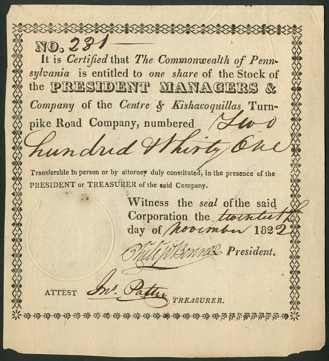 U.S.A: Centre & Kishacoquillas Turnpike Road Co., one share, 182[2], #231, smal format, ornate border, black, embossed seal. Slightly brittle, EF.
