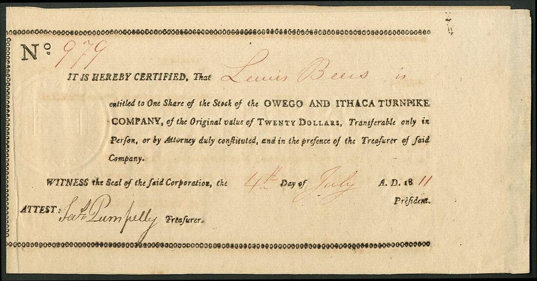 U.S.A: Owego and Ithaca Turnpike Company, a group of three certificates, 2 for one $20 share of 7% stock, both 18[10], #262 and 280, and the later piece for 'original value of $20', 18[11], #979, issued to the president Lewis Beers who signs the earlier pieces. Incorporated in New York. All EF (3).